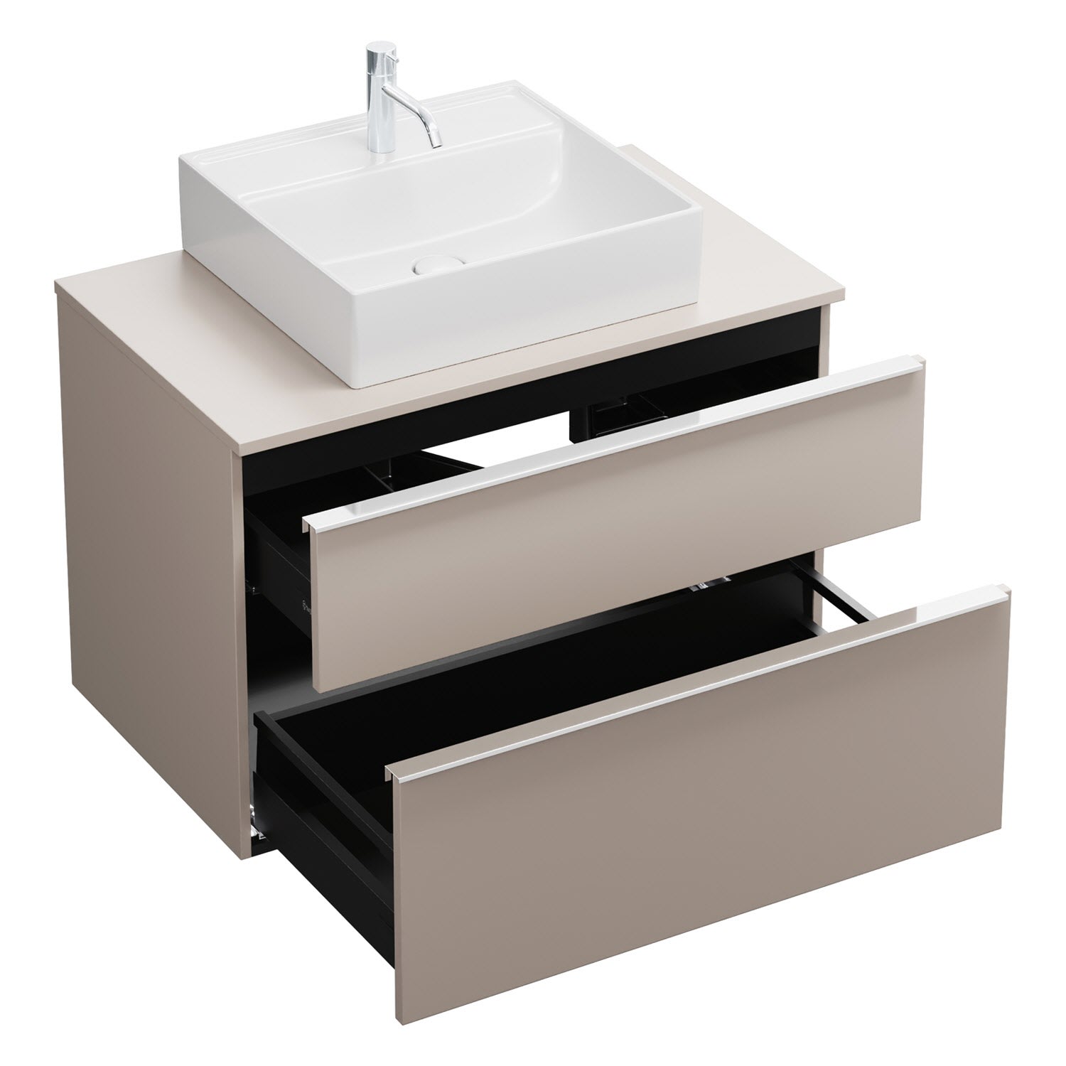 - 1 Schublade oben, 35 cm tief, mit Siphonausschnitt und Inneneinteilung