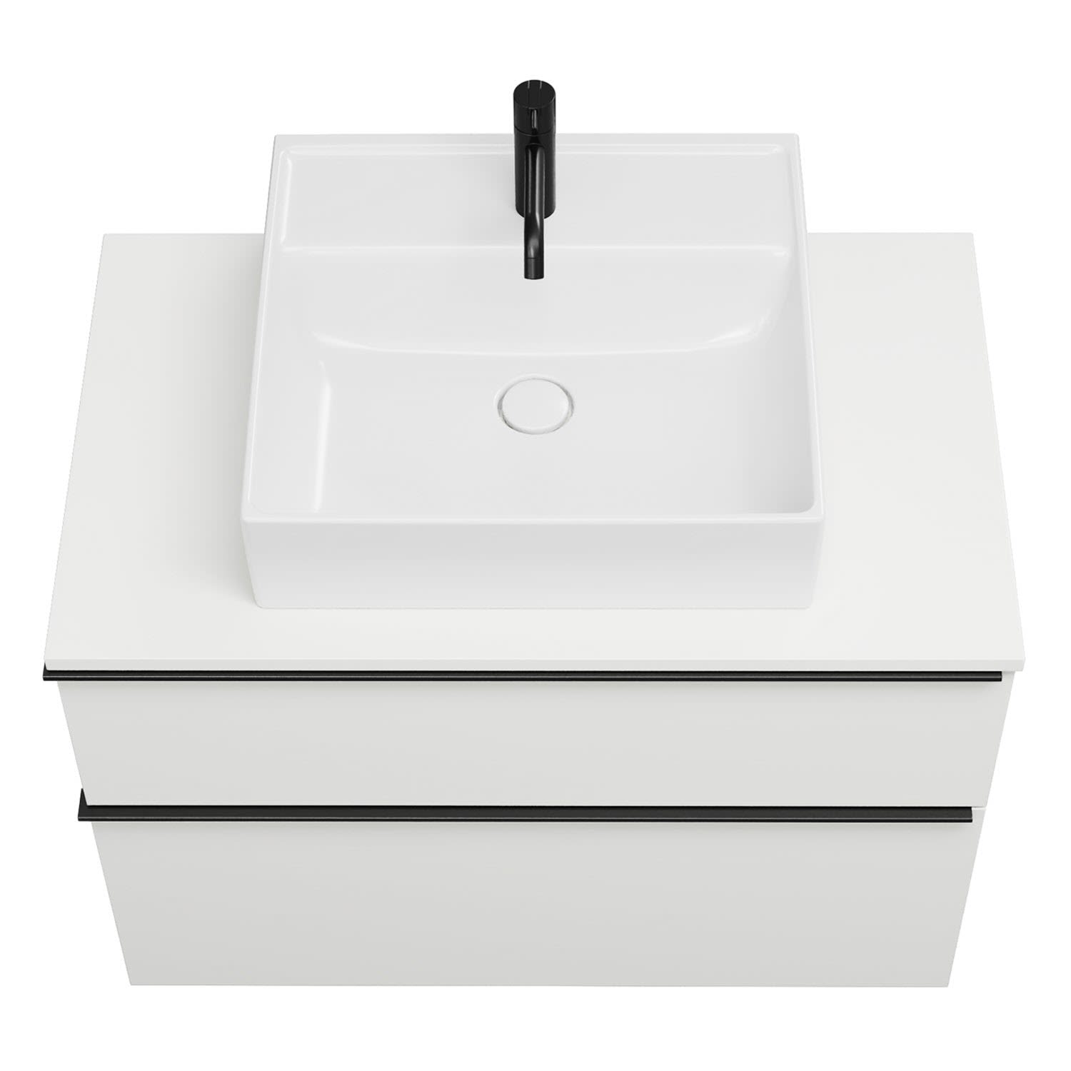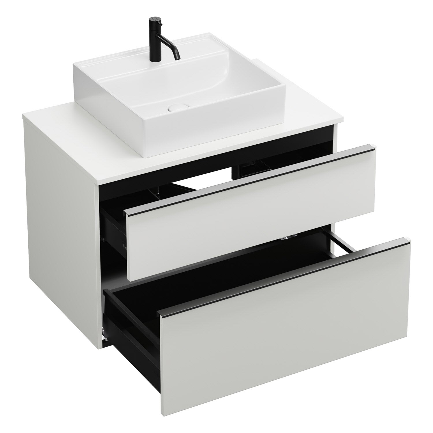 - 1 Schublade oben, 35 cm tief, mit Siphonausschnitt und Inneneinteilung