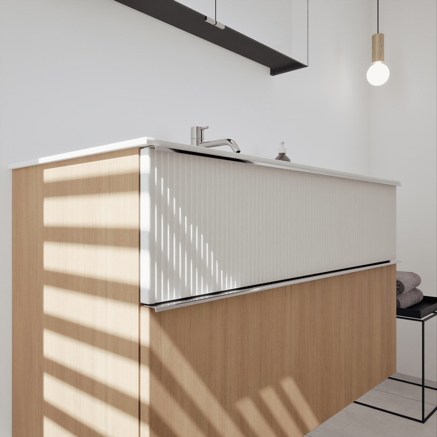 - 1 Schublade oben 35 cm tief, mit vertikaler Struktur inkl. Siphonausschnitt und Inneneinteilung