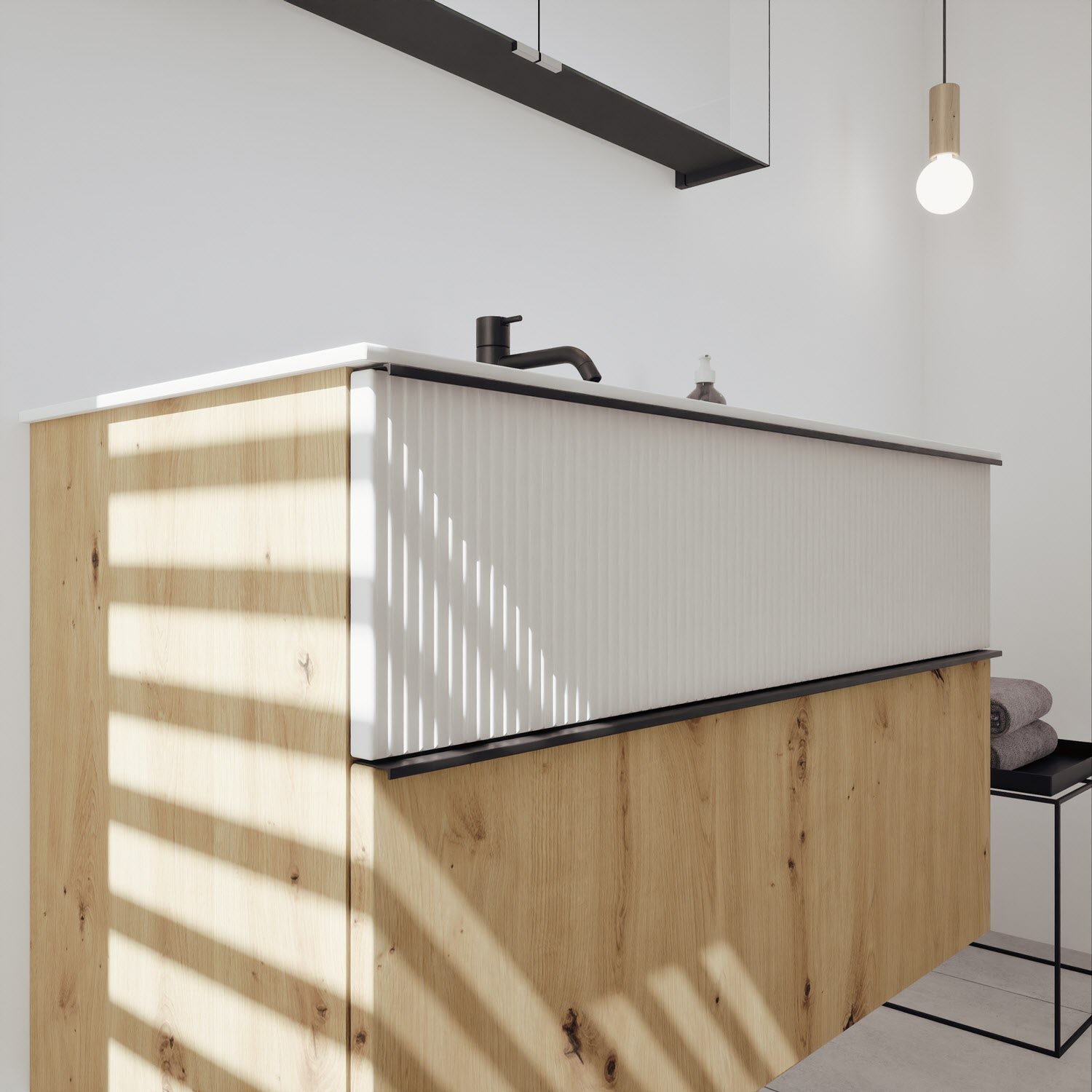 - 1 Schublade oben 35 cm tief, mit vertikaler Struktur inkl. Siphonausschnitt und Inneneinteilung