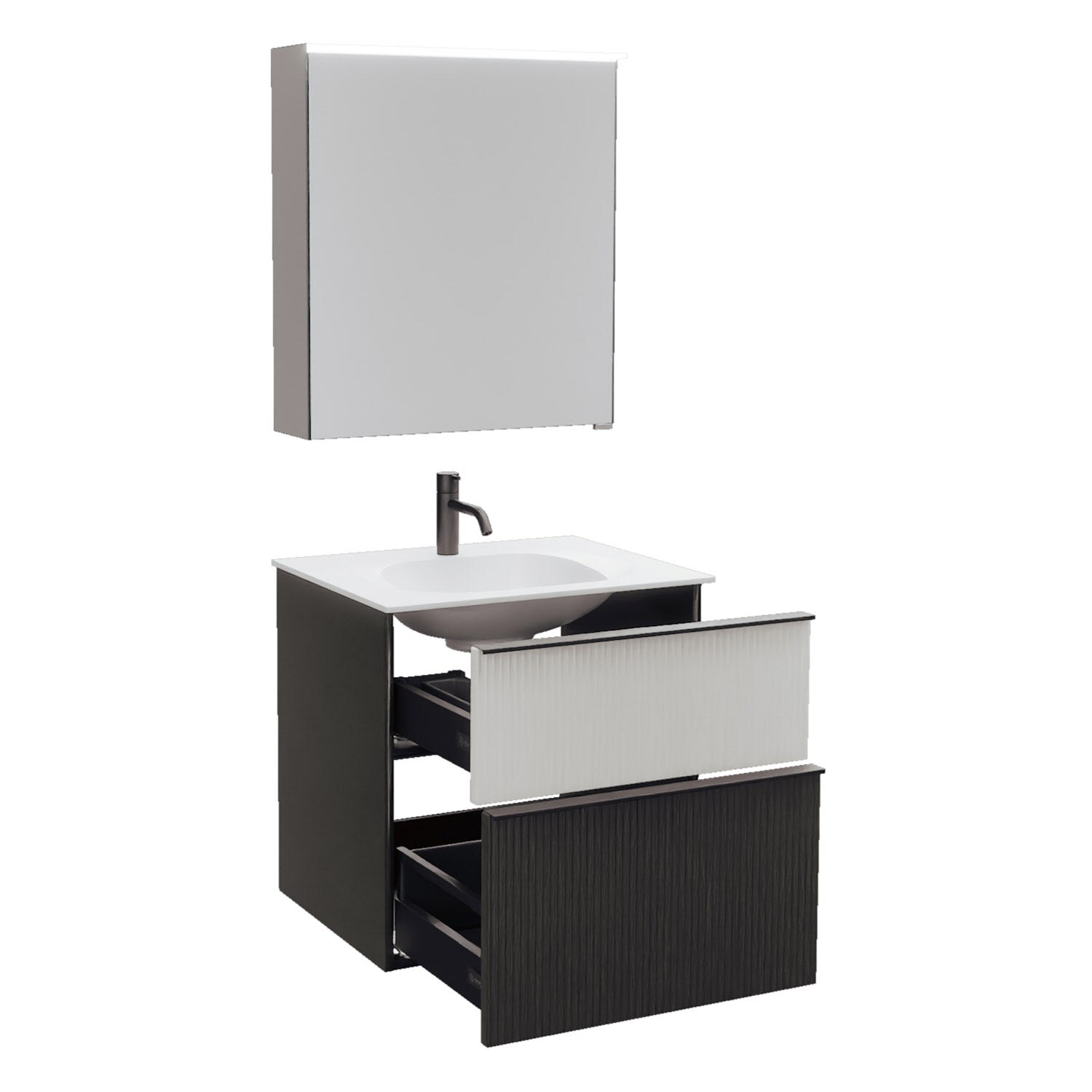 - 1 Schublade oben, 35 cm tief, mit vertikaler Struktur inkl. Siphonausschnitt und Inneneinteilung