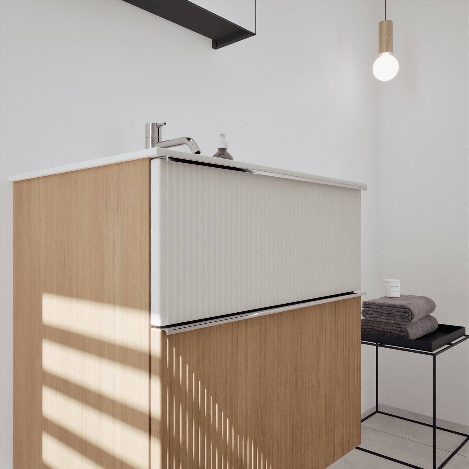 - 1 Schublade oben, 35 cm tief, mit vertikaler Struktur inkl. Siphonausschnitt und Inneneinteilung