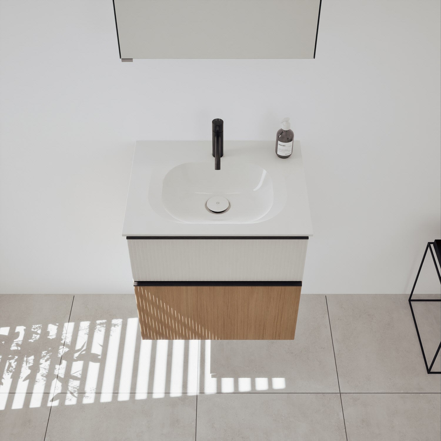 - 1 Schublade oben, 35 cm tief, mit vertikaler Struktur inkl. Siphonausschnitt und Inneneinteilung