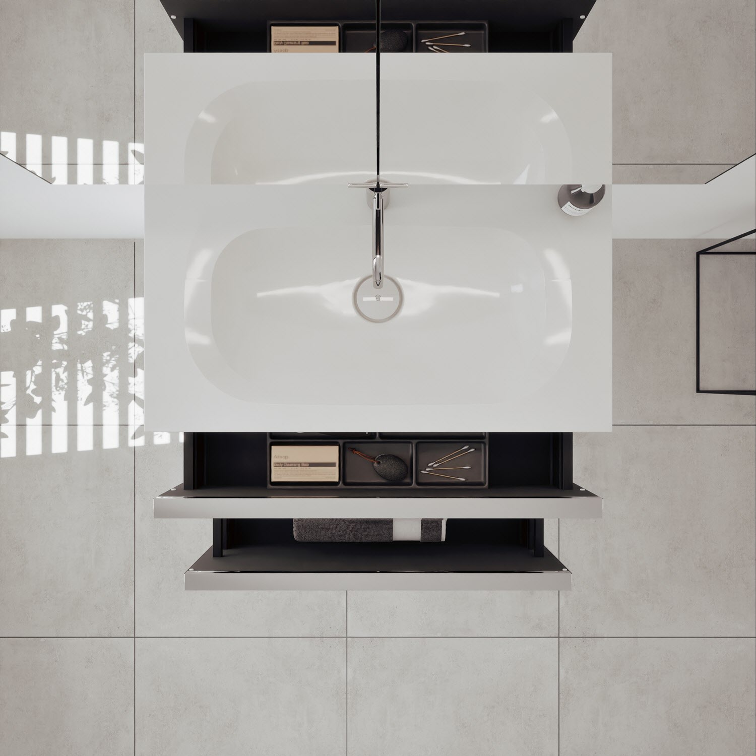 - 1 Schublade oben, 35 cm tief, mit vertikaler Struktur inkl. Siphonausschnitt und Inneneinteilung