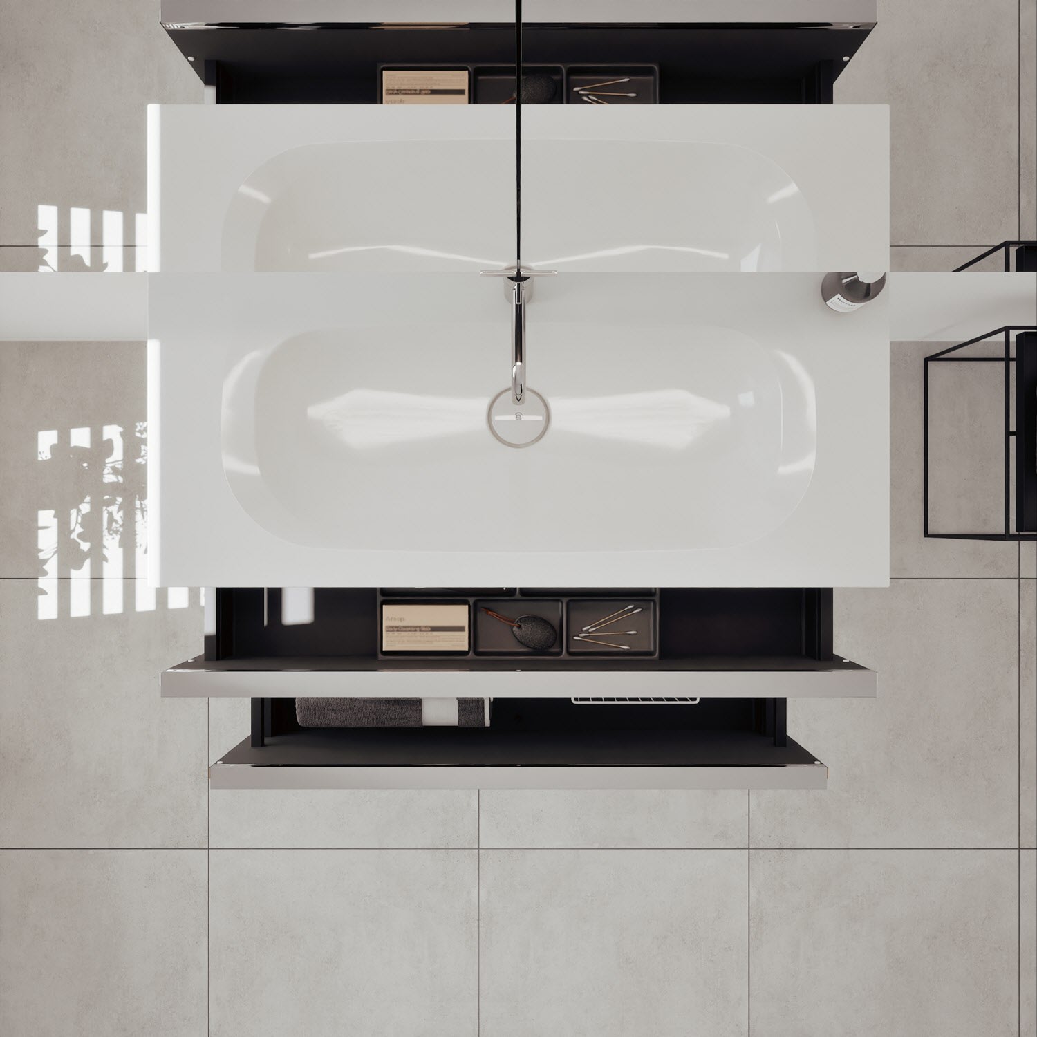 - 1 Schublade oben, 35 cm tief, mit vertikaler Struktur inkl. Siphonausschnitt und Inneneinteilung