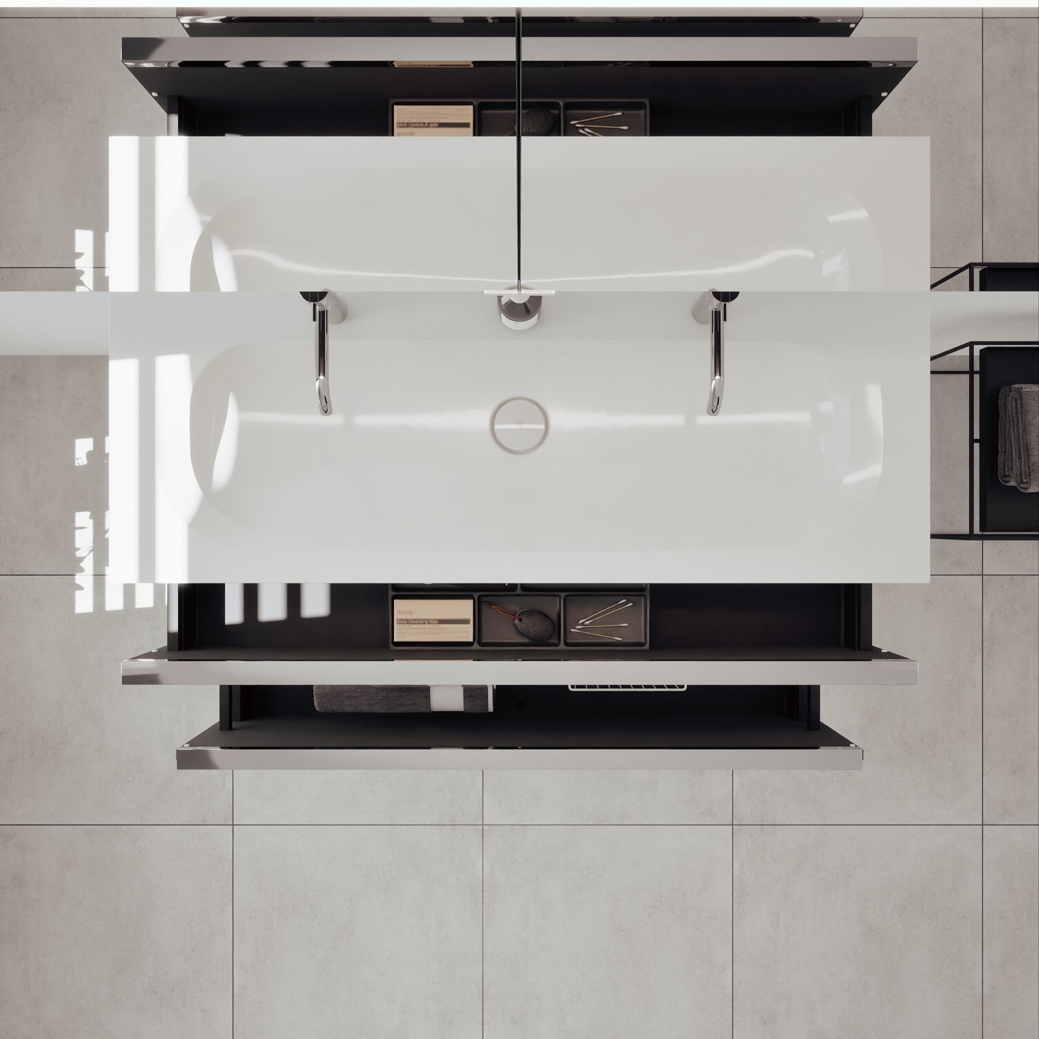 - 1 Schublade oben, 35 cm tief, mit vertikaler Struktur inkl. Siphonausschnitt und Inneneinteilung