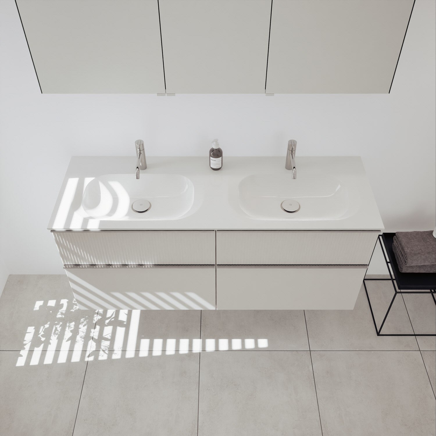 - 2 Schubladen oben, 35 cm tief, mit vertikaler Struktur inkl. mit Siphonausschnitt und Inneneinteilung
