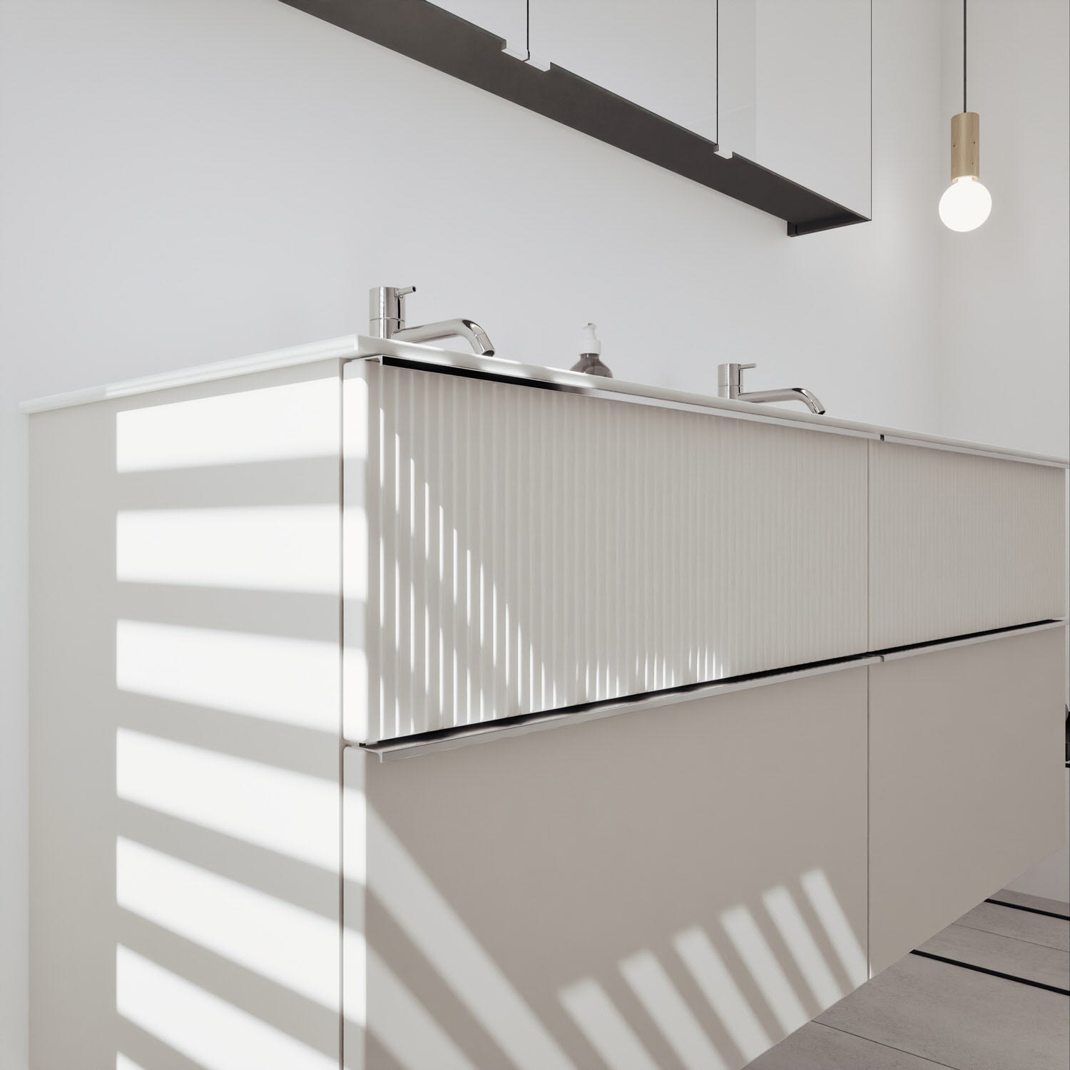 - 2 Schubladen oben, 35 cm tief, mit vertikaler Struktur inkl. mit Siphonausschnitt und Inneneinteilung