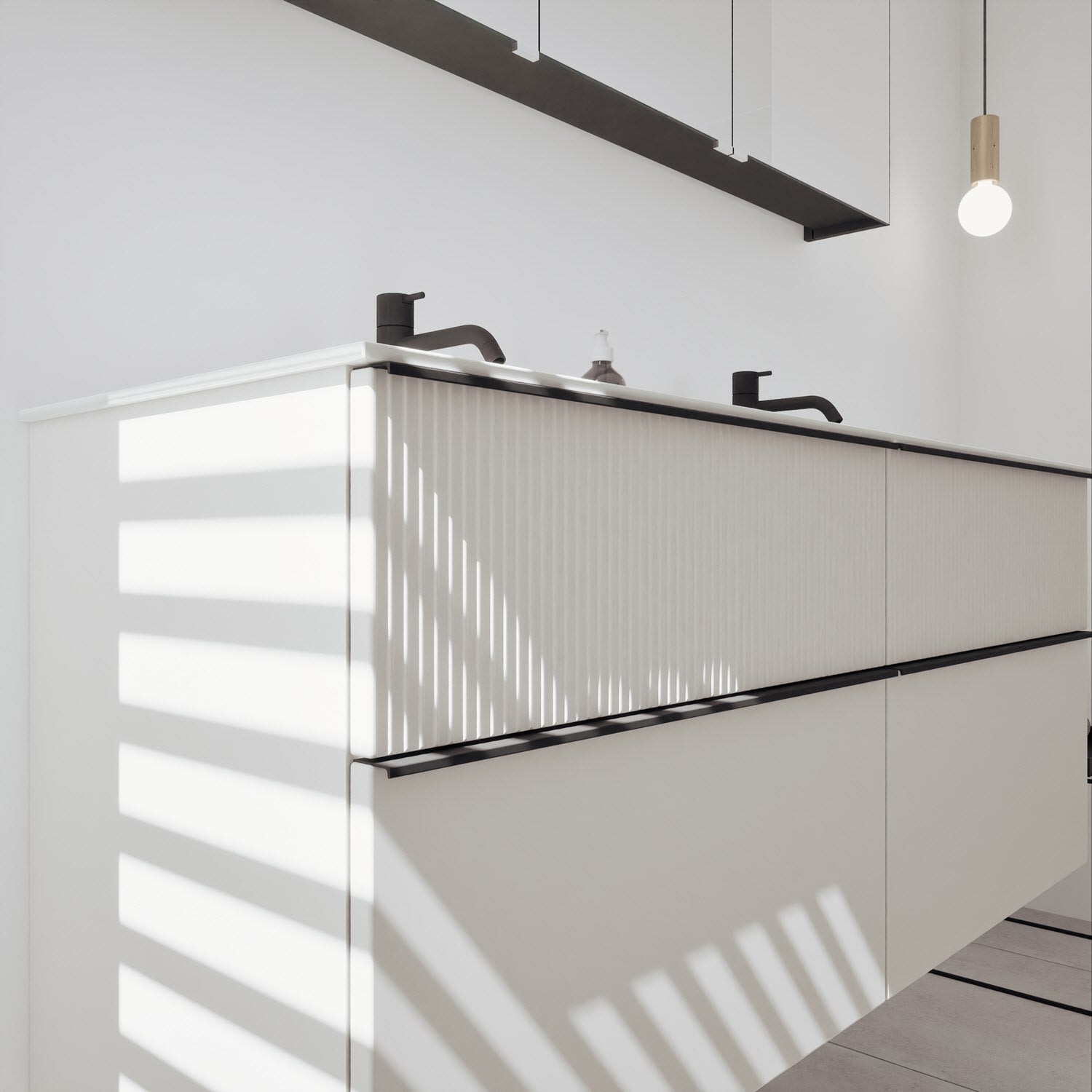 - 2 Schubladen oben, 35 cm tief, mit vertikaler Struktur inkl. mit Siphonausschnitt und Inneneinteilung