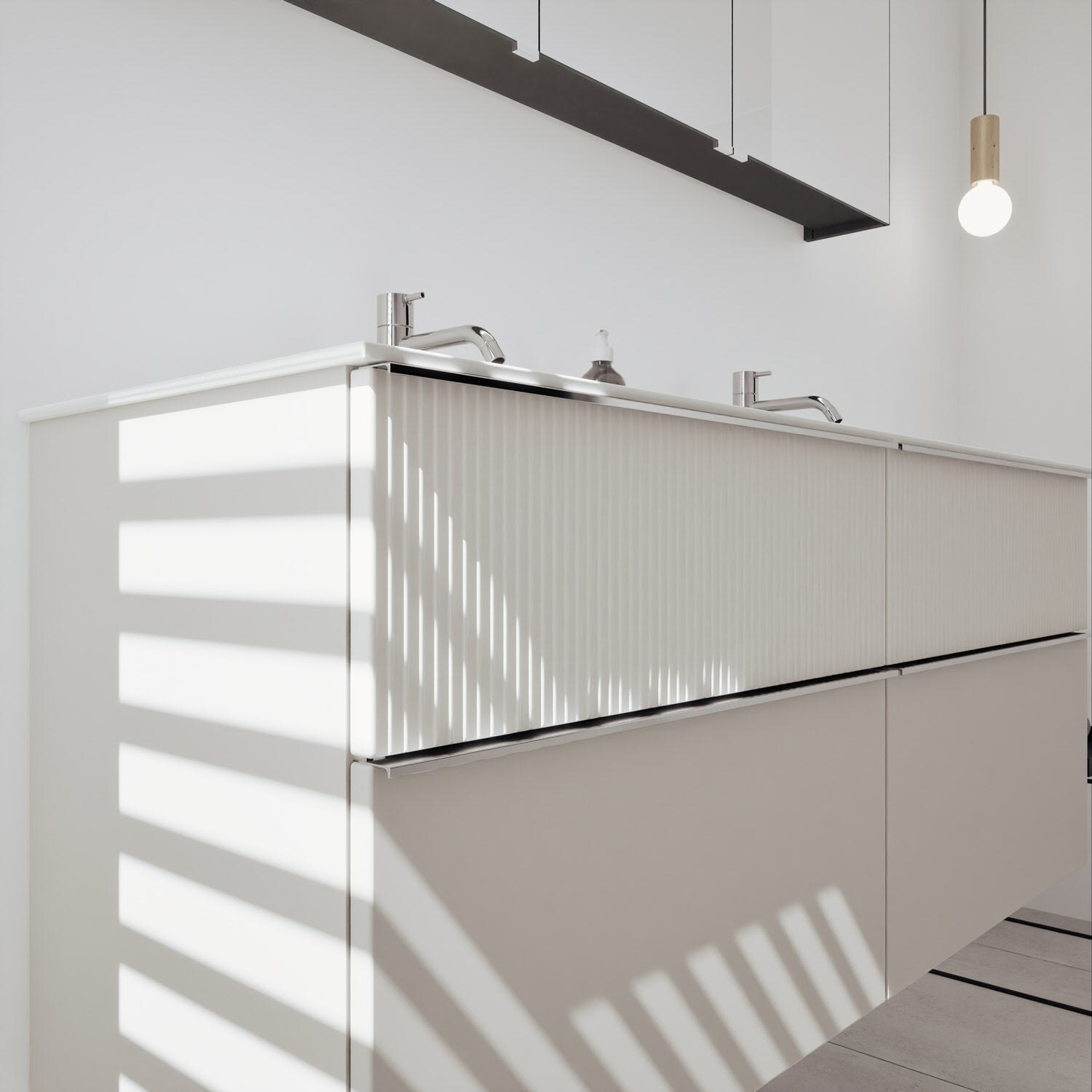 - 2 Schubladen oben, 35 cm tief, mit vertikaler Struktur inkl. mit Siphonausschnitt und Inneneinteilung