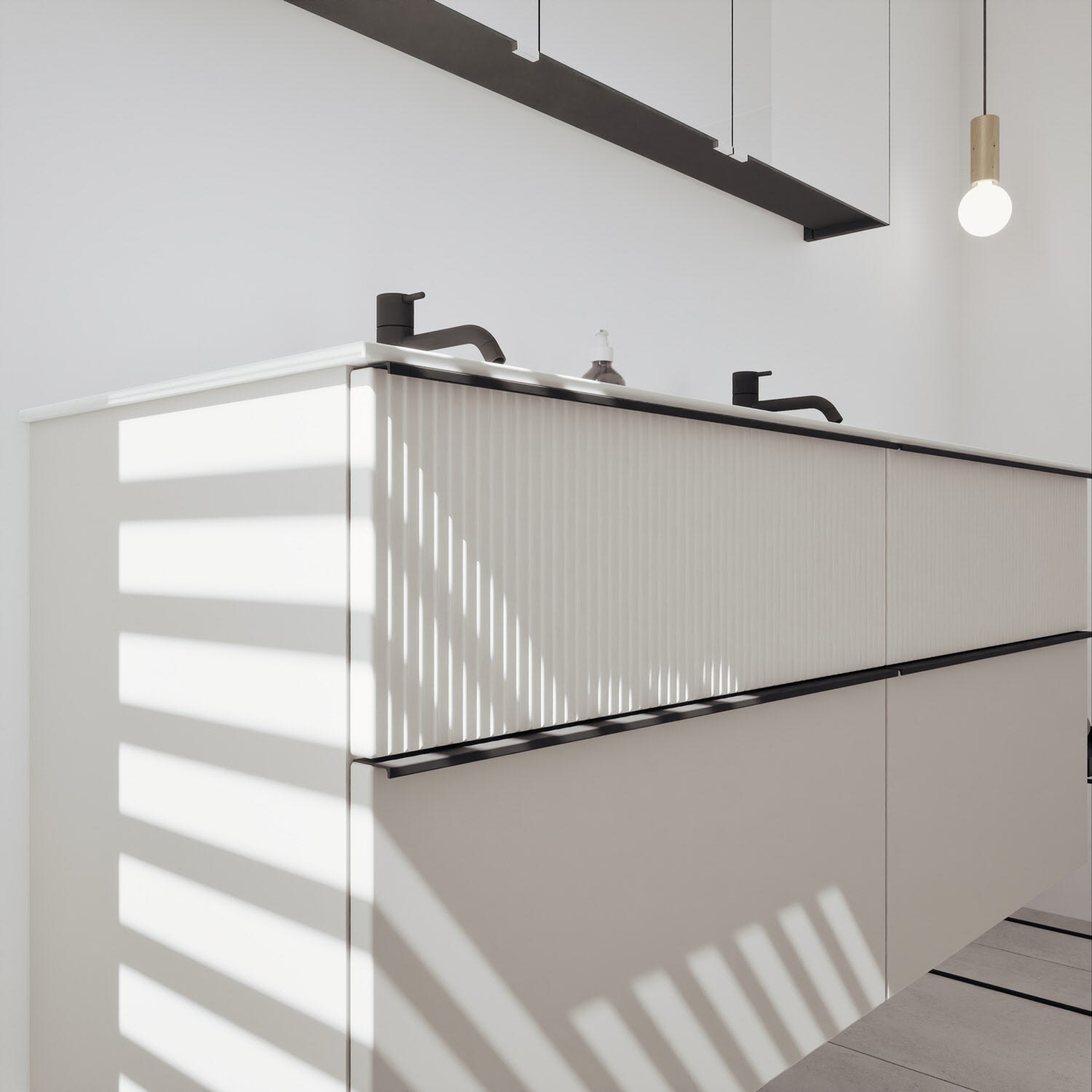 - 2 Schubladen oben, 35 cm tief, mit vertikaler Struktur inkl. mit Siphonausschnitt und Inneneinteilung