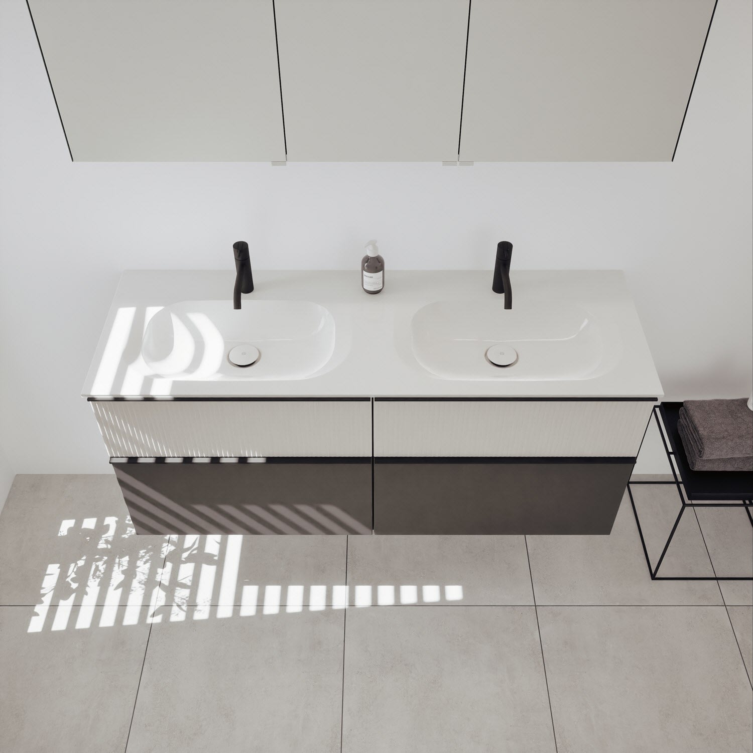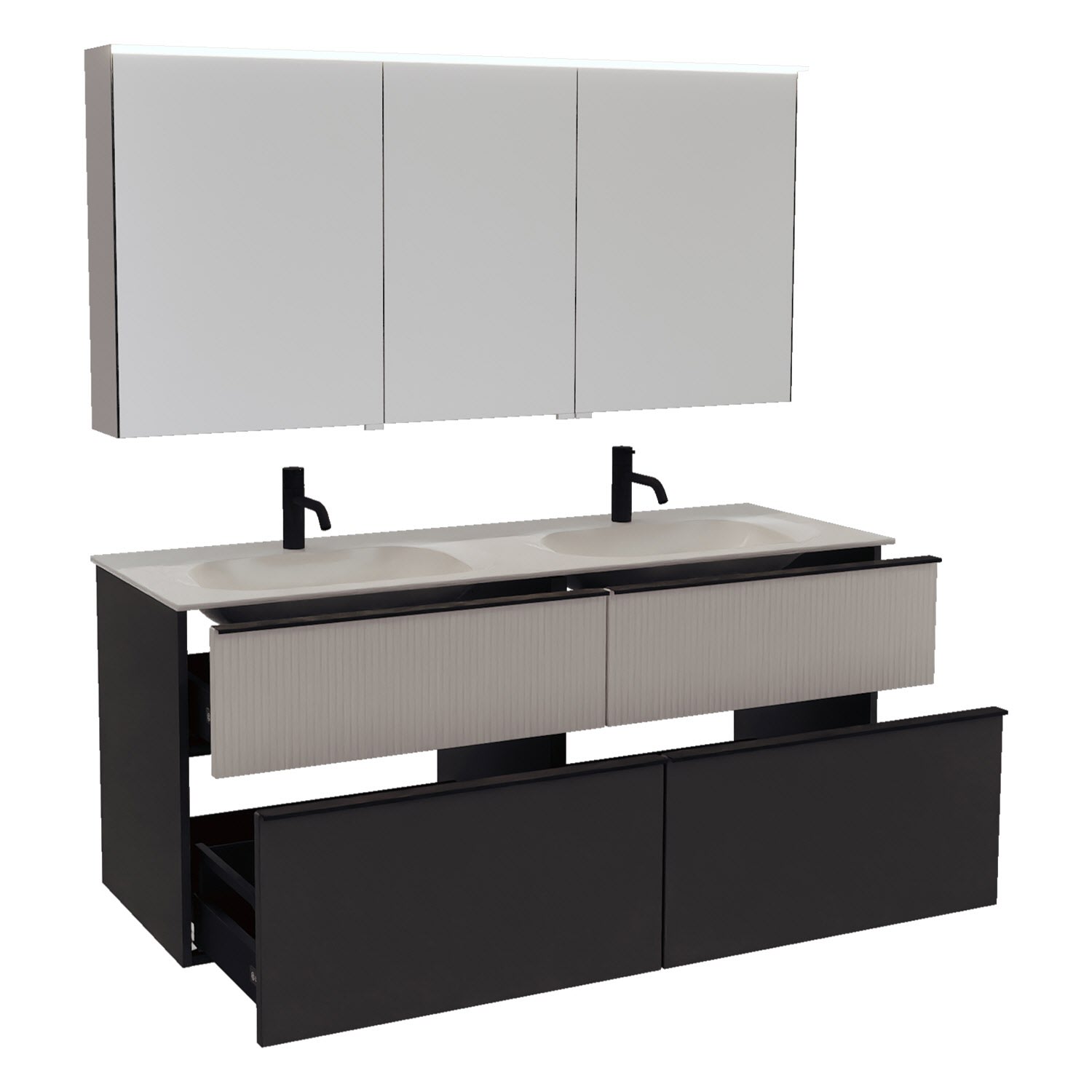 - 2 Schubladen oben, 35 cm tief, mit vertikaler Struktur inkl. mit Siphonausschnitt und Inneneinteilung
