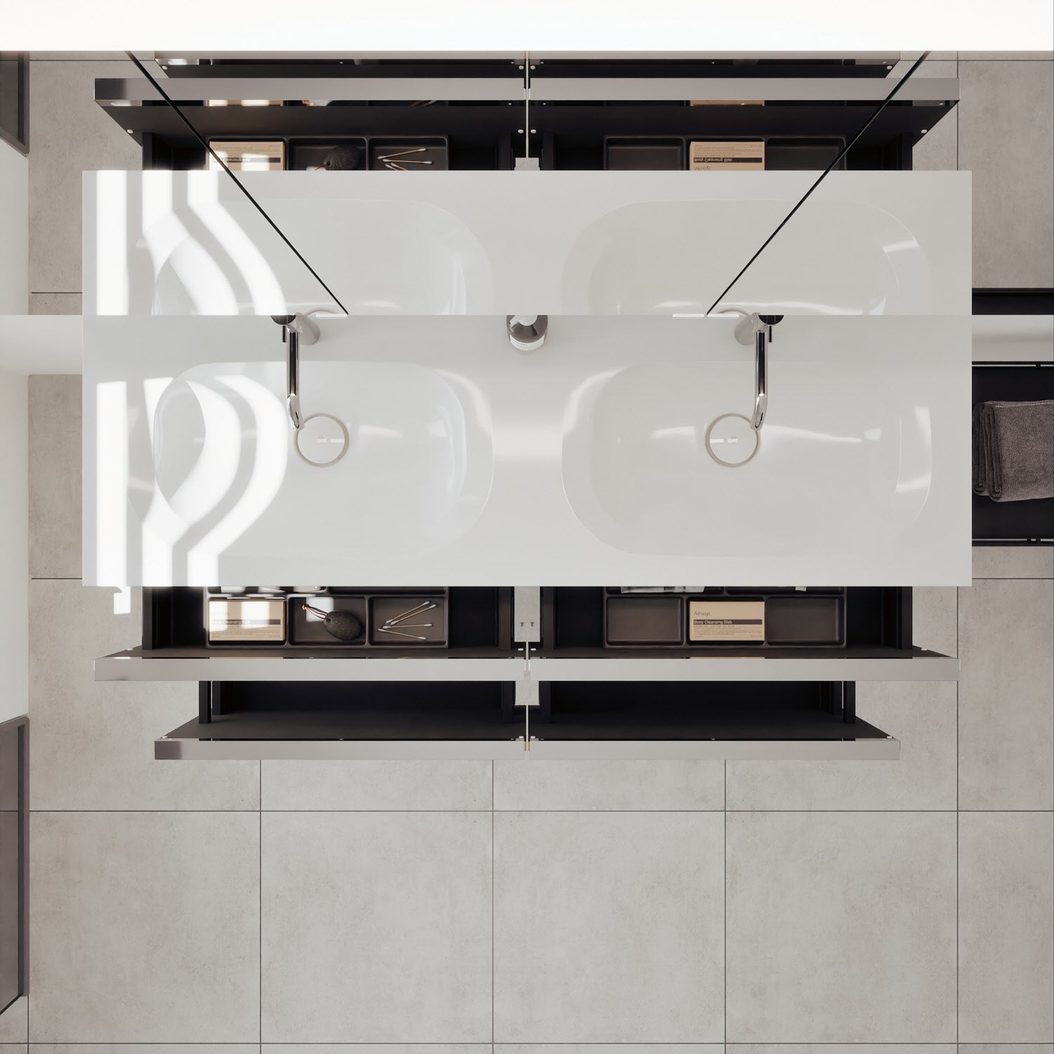 - 2 Schubladen oben, 35 cm tief, mit vertikaler Struktur inkl. mit Siphonausschnitt und Inneneinteilung