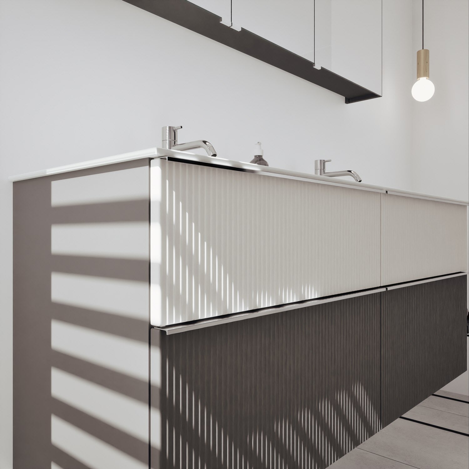- 2 Schubladen oben, 35 cm tief, mit vertikaler Struktur inkl. mit Siphonausschnitt und Inneneinteilung