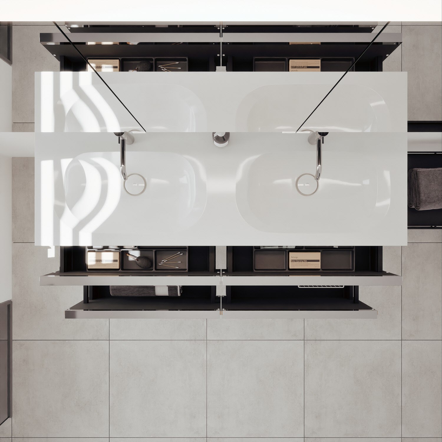 - 2 Schubladen oben, 35 cm tief, mit vertikaler Struktur inkl. mit Siphonausschnitt und Inneneinteilung