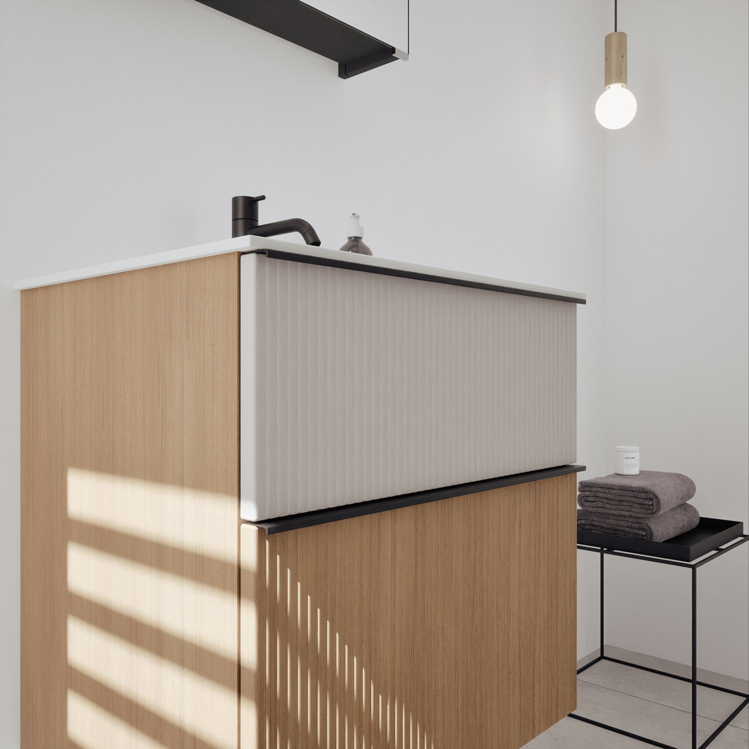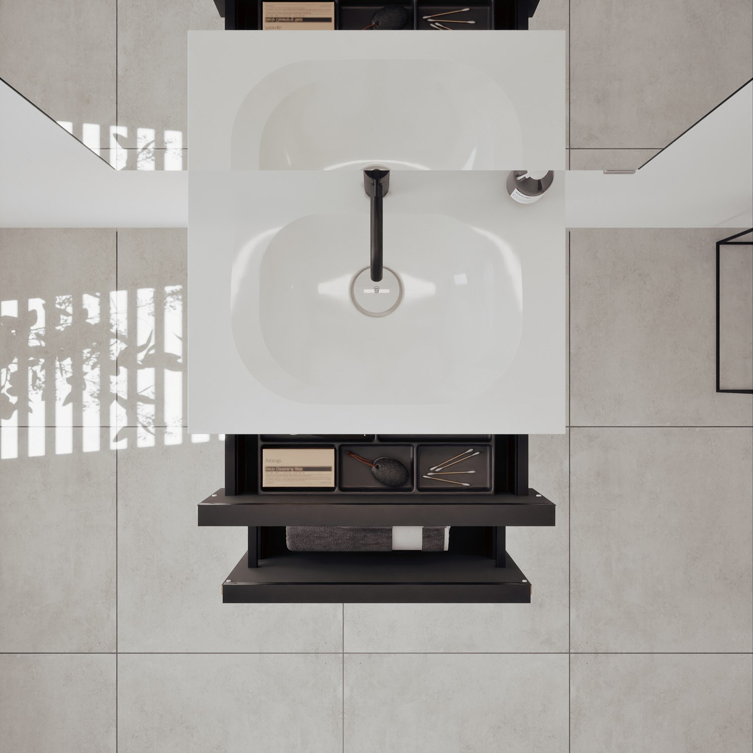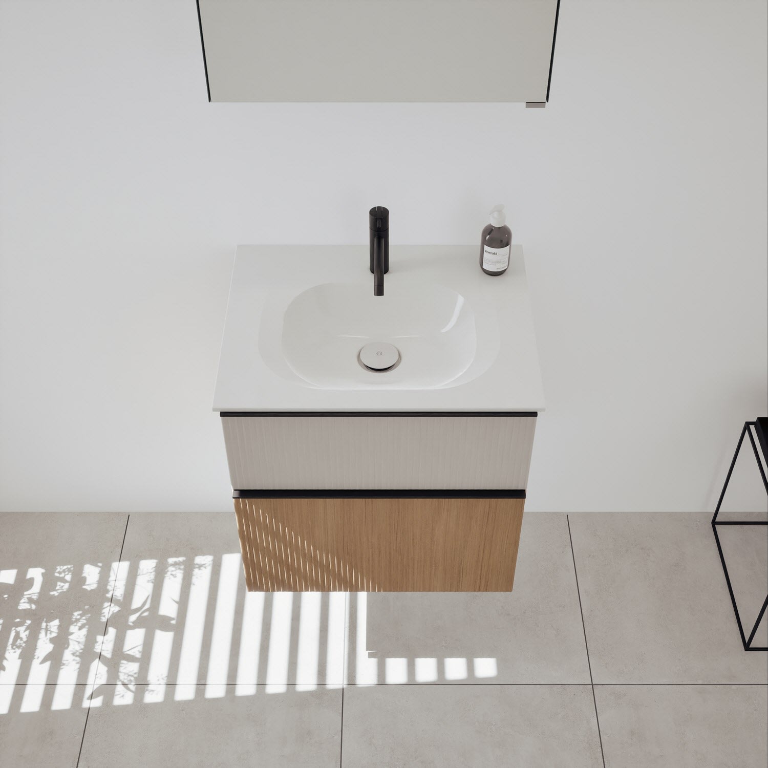 - 1 Schublade oben, 35 cm tief, mit vertikaler Struktur inkl. Siphonausschnitt und Inneneinteilung