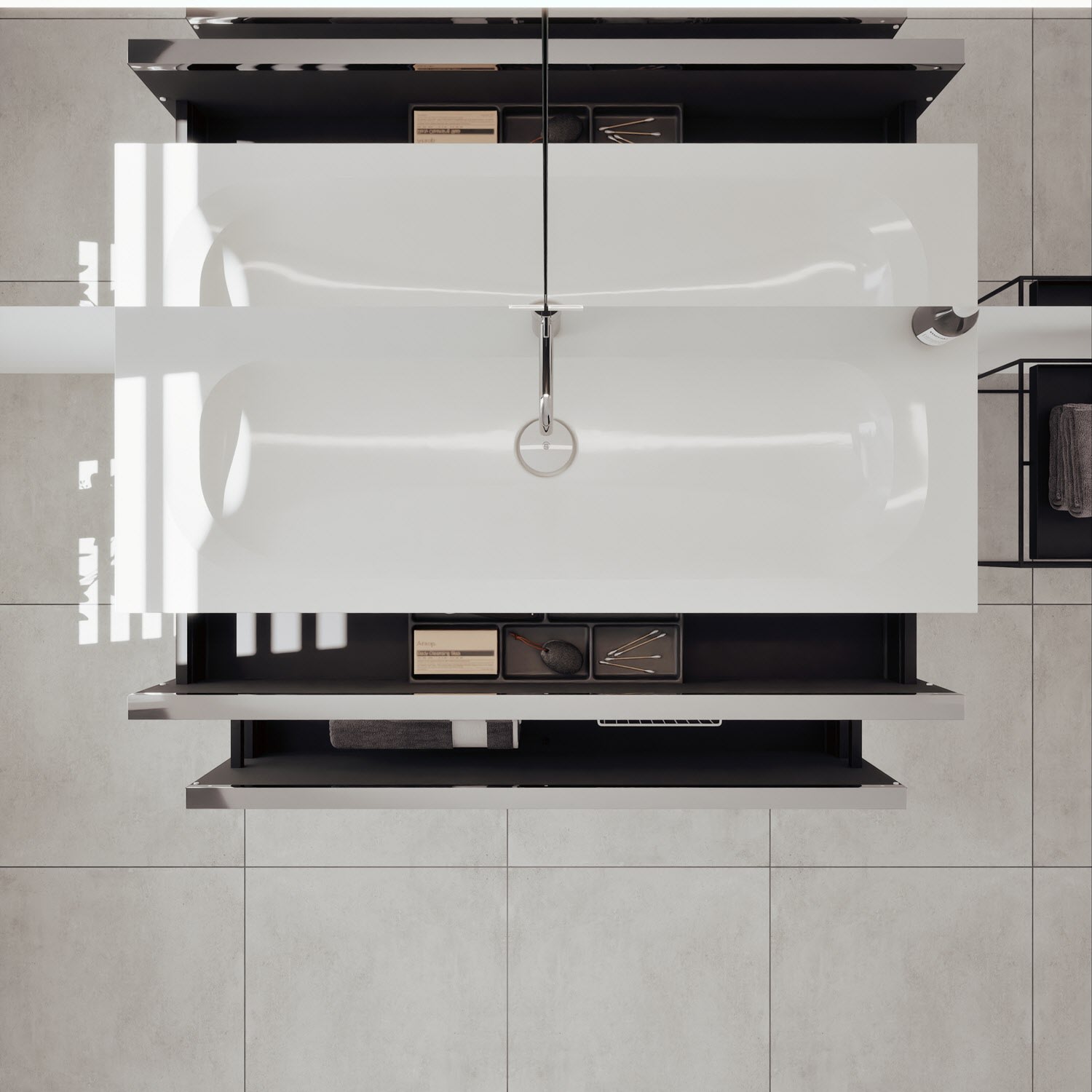 - 1 Schublade oben, 35 cm tief, mit vertikaler Struktur inkl. Siphonausschnitt und Inneneinteilung