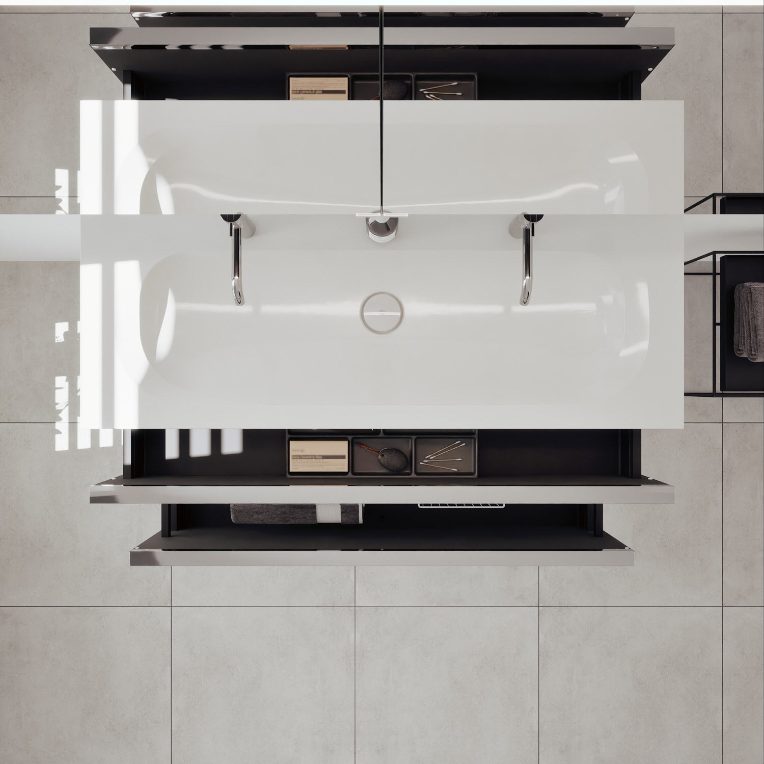 - 1 Schublade oben, 35 cm tief, mit vertikaler Struktur inkl. Siphonausschnitt und Inneneinteilung