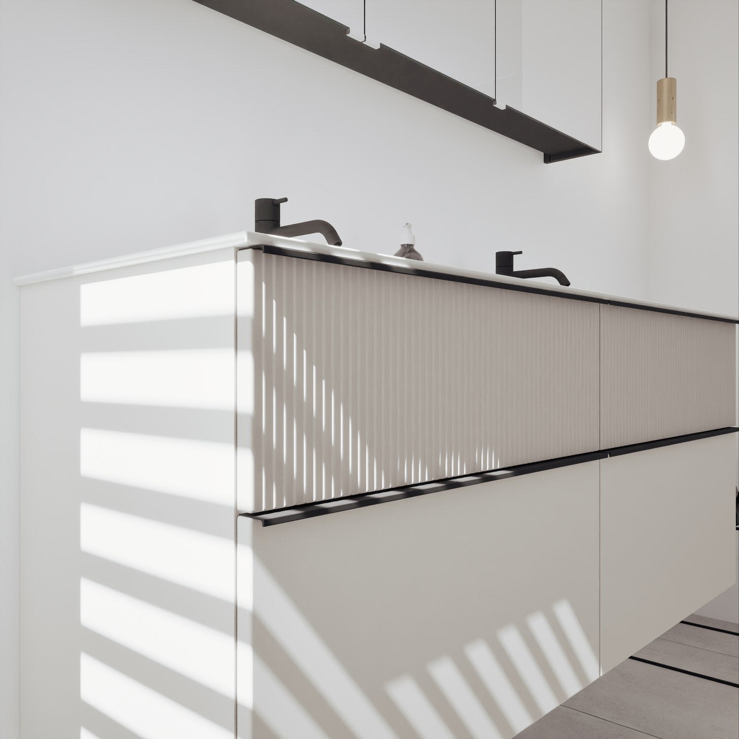 - 2 Schubladen oben, 35 cm tief, mit vertikaler Struktur inkl. mit Siphonausschnitt und Inneneinteilung