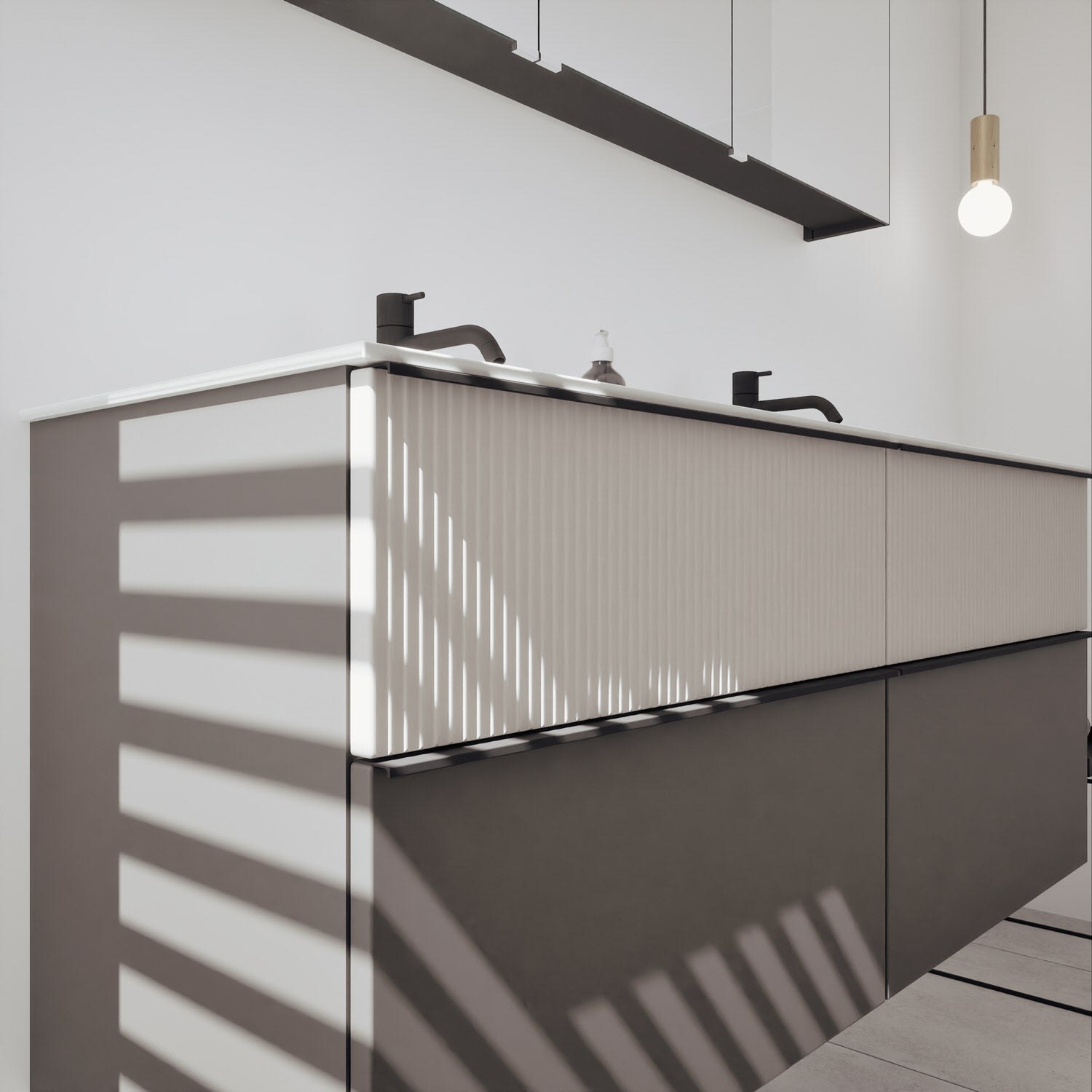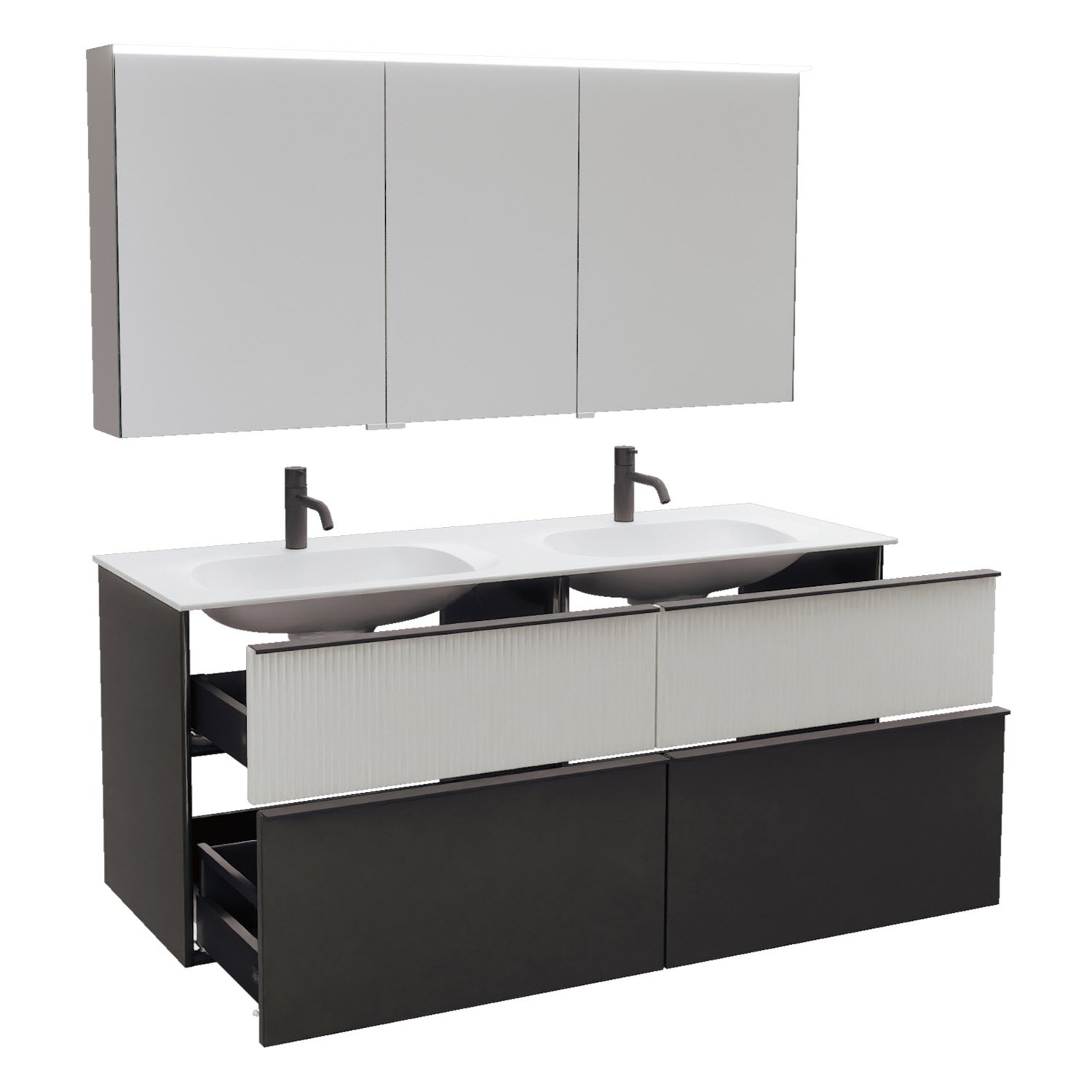 - 2 Schubladen oben, 35 cm tief, mit vertikaler Struktur inkl. mit Siphonausschnitt und Inneneinteilung