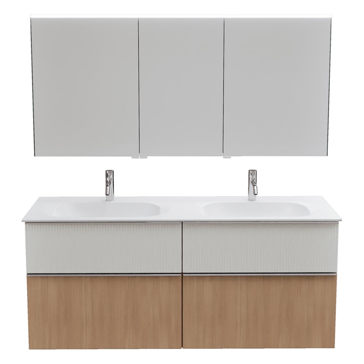 - 2 Schubladen oben, 35 cm tief, mit vertikaler Struktur inkl. mit Siphonausschnitt und Inneneinteilung