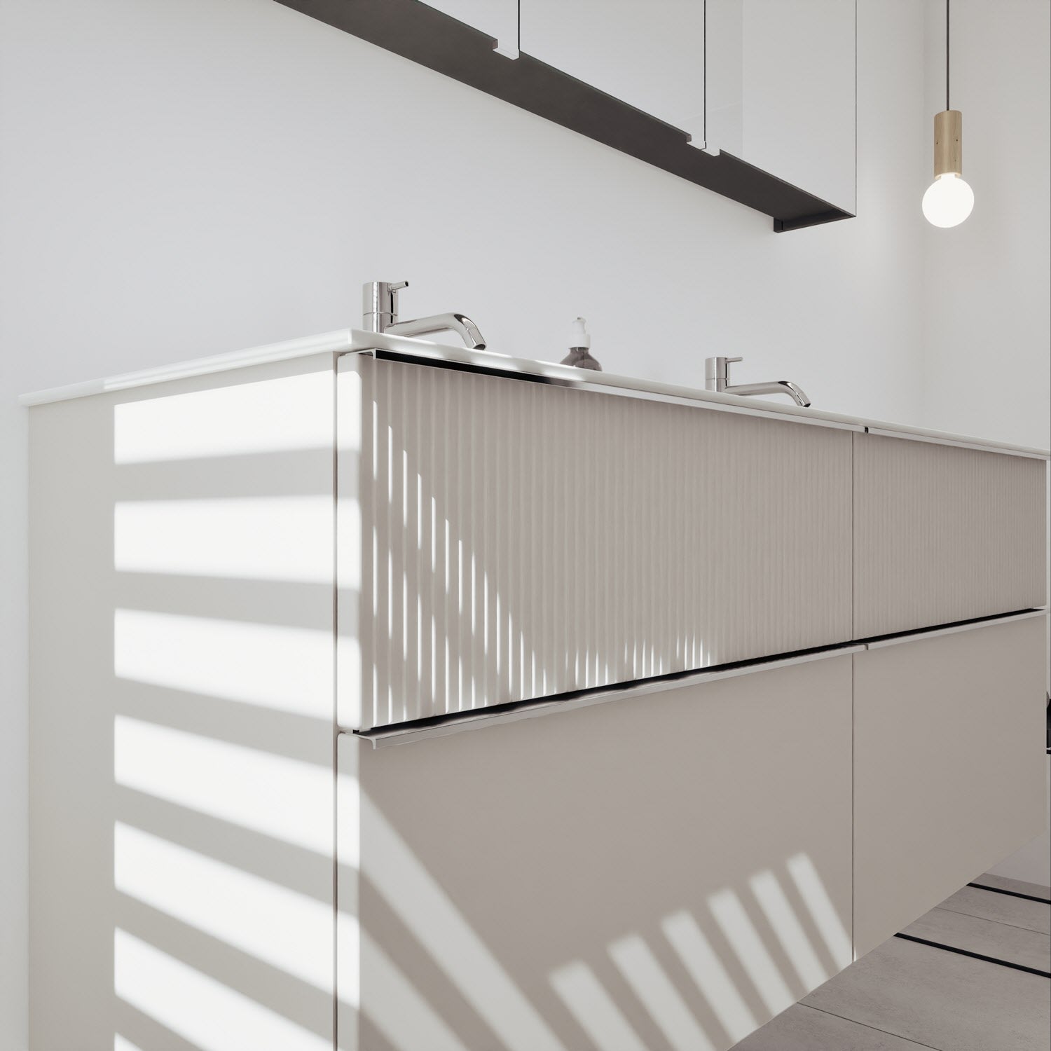- 2 Schubladen oben, 35 cm tief, mit vertikaler Struktur inkl. mit Siphonausschnitt und Inneneinteilung