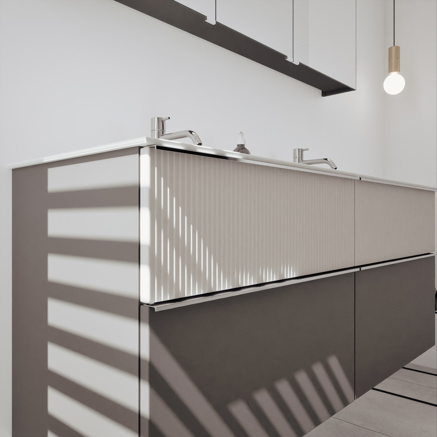 - 2 Schubladen oben, 35 cm tief, mit vertikaler Struktur inkl. mit Siphonausschnitt und Inneneinteilung
