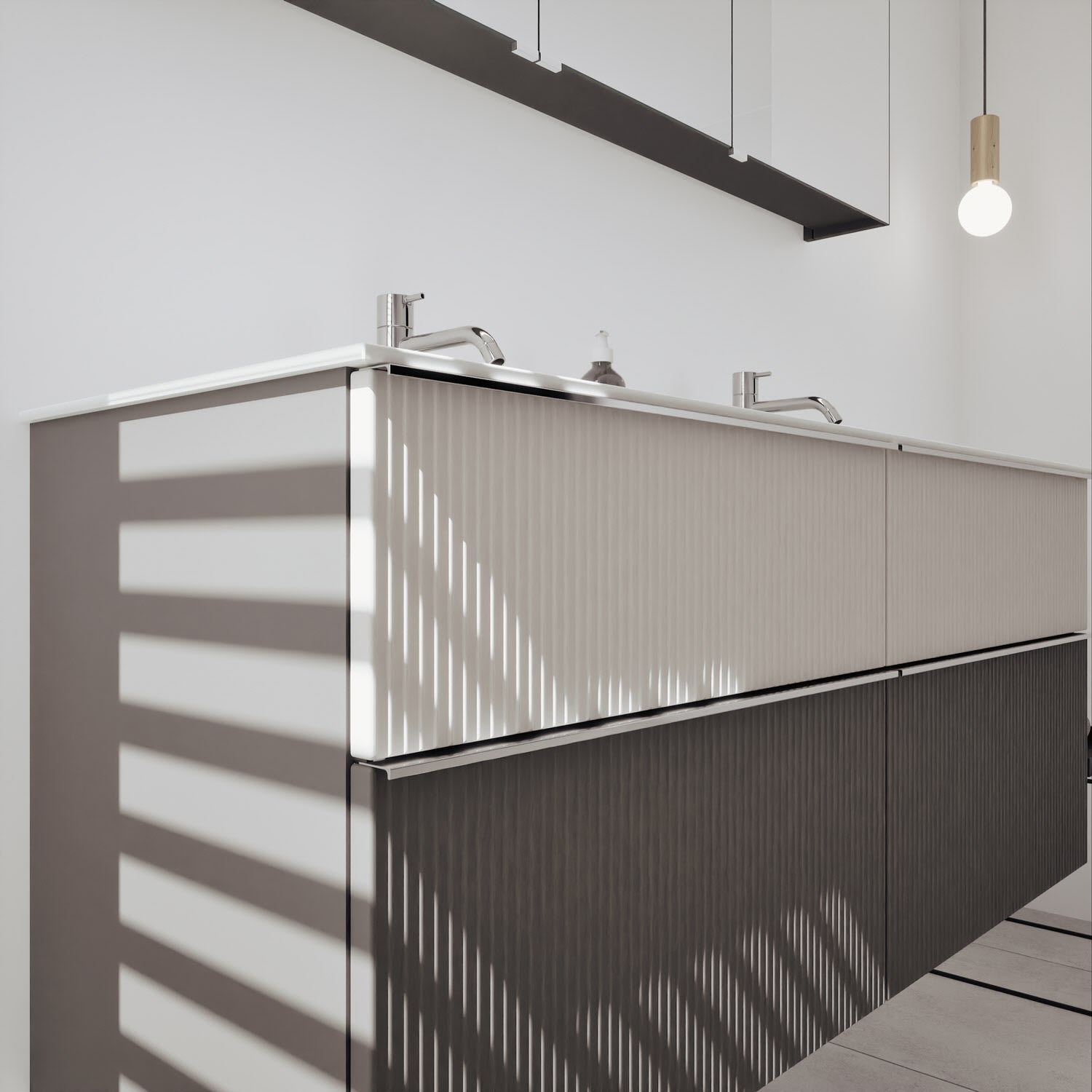 - 2 Schubladen oben, 35 cm tief, mit vertikaler Struktur inkl. mit Siphonausschnitt und Inneneinteilung