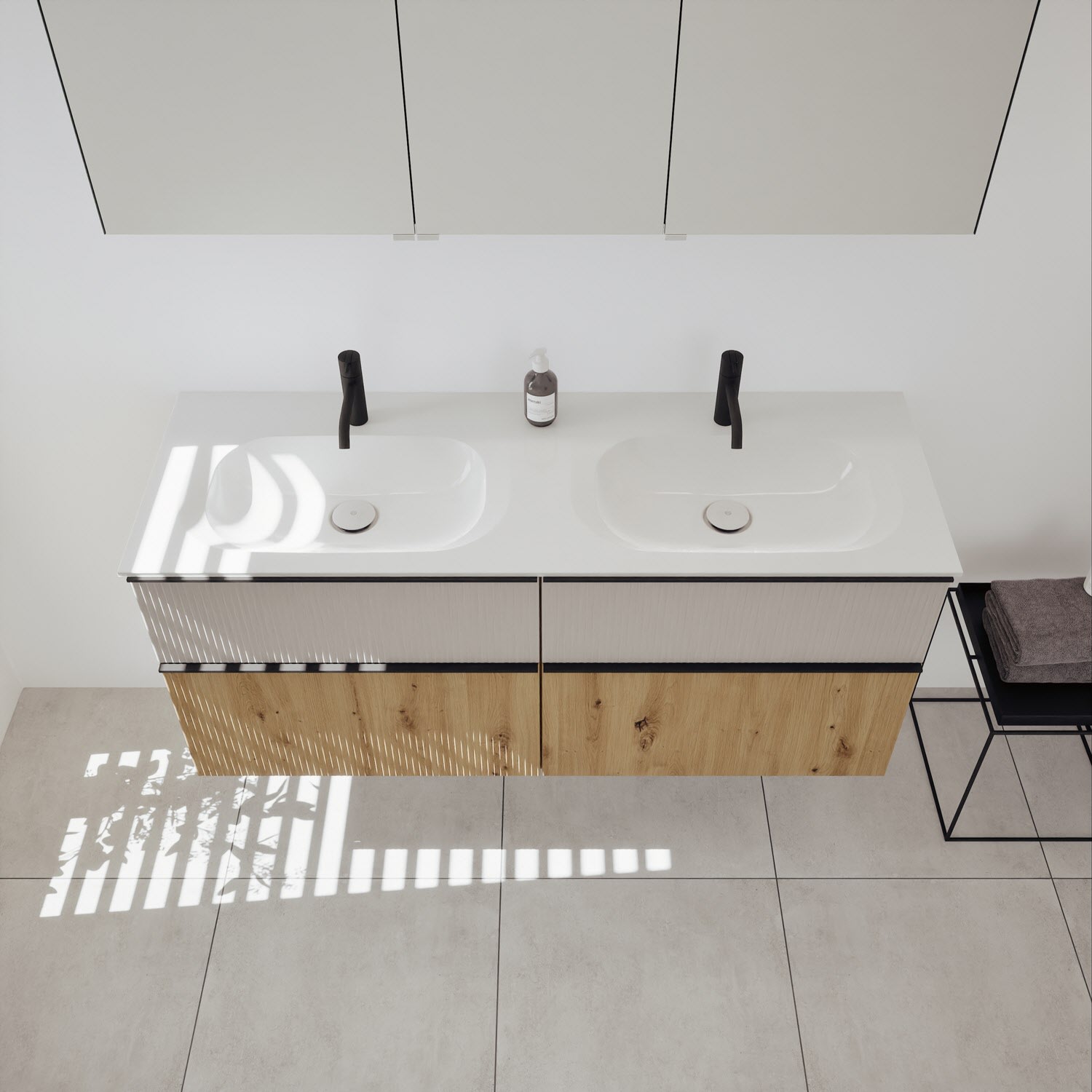 - 2 Schubladen oben, 35 cm tief, mit vertikaler Struktur inkl. mit Siphonausschnitt und Inneneinteilung