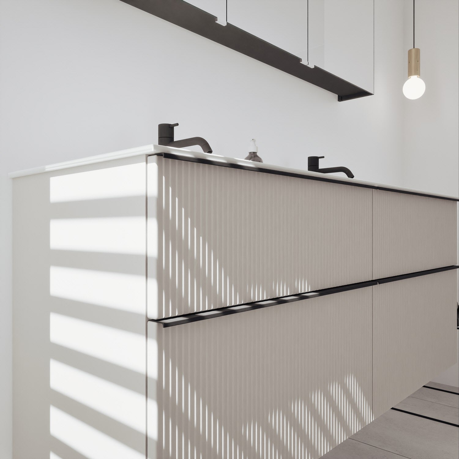 - 2 Schubladen oben, 35 cm tief, mit vertikaler Struktur inkl. mit Siphonausschnitt und Inneneinteilung
