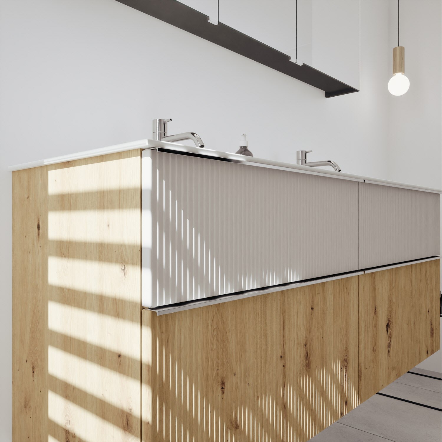 - 2 Schubladen oben, 35 cm tief, mit vertikaler Struktur inkl. mit Siphonausschnitt und Inneneinteilung