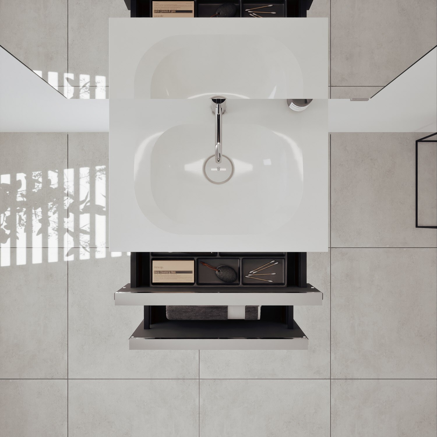 - 1 Schublade oben: 35 cm tief, mit Siphonausschnitt und Inneneinteilung