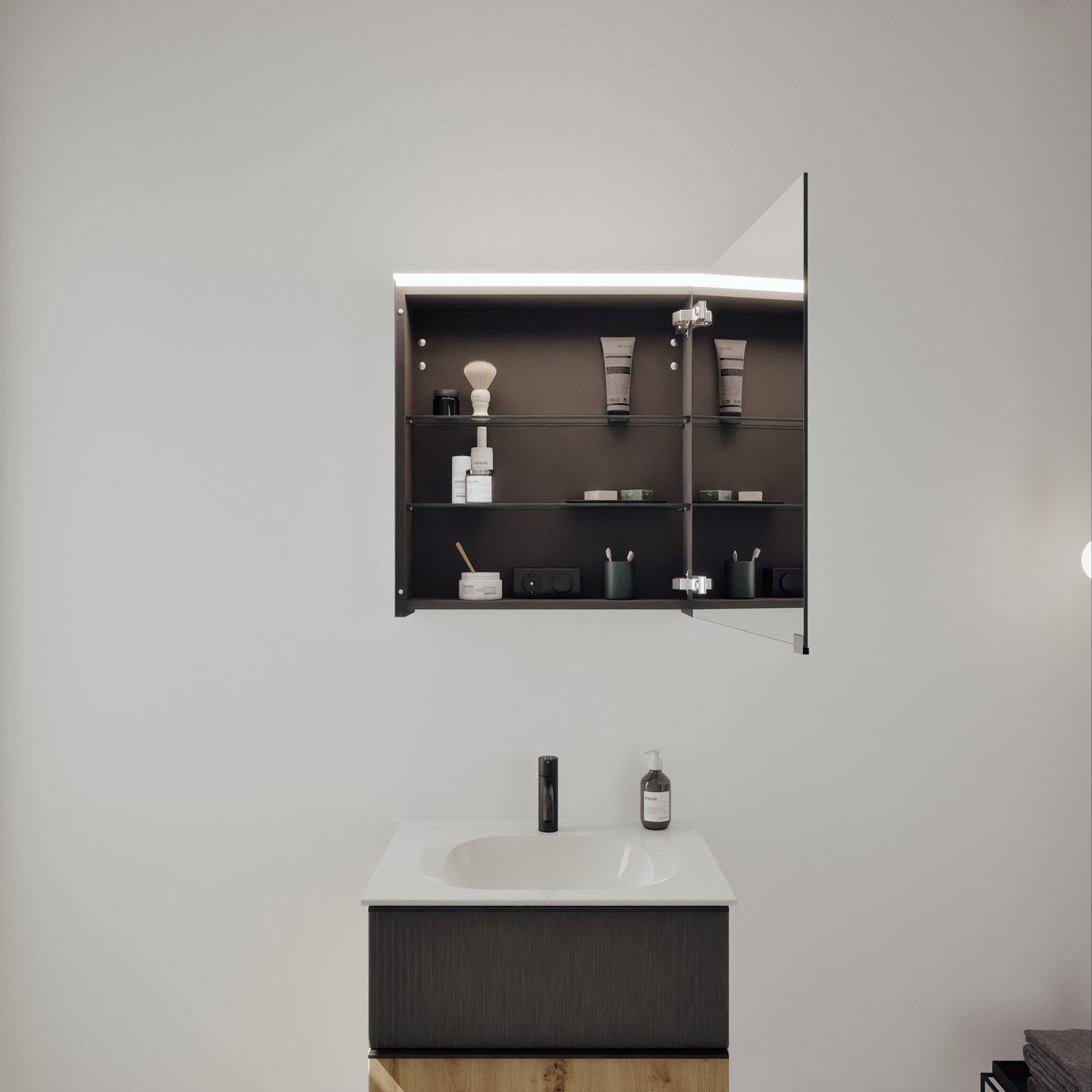- Spiegelschrank, Waschtischunterschrank, Waschtisch, burgbad cleanFlow, Befestigung außer Stockschrauben