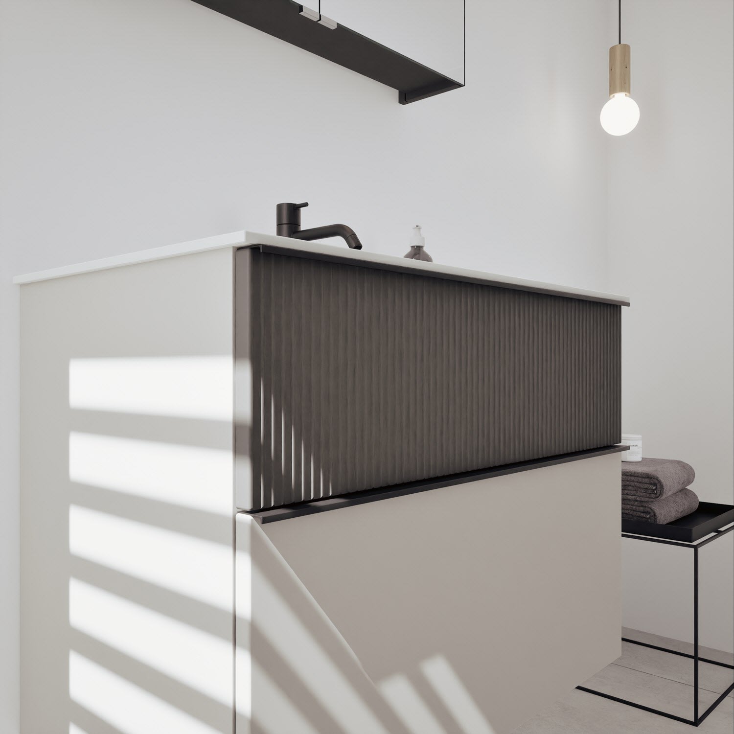 - 1 Schublade oben 35 cm tief, mit vertikaler Struktur inkl. Siphonausschnitt und Inneneinteilung