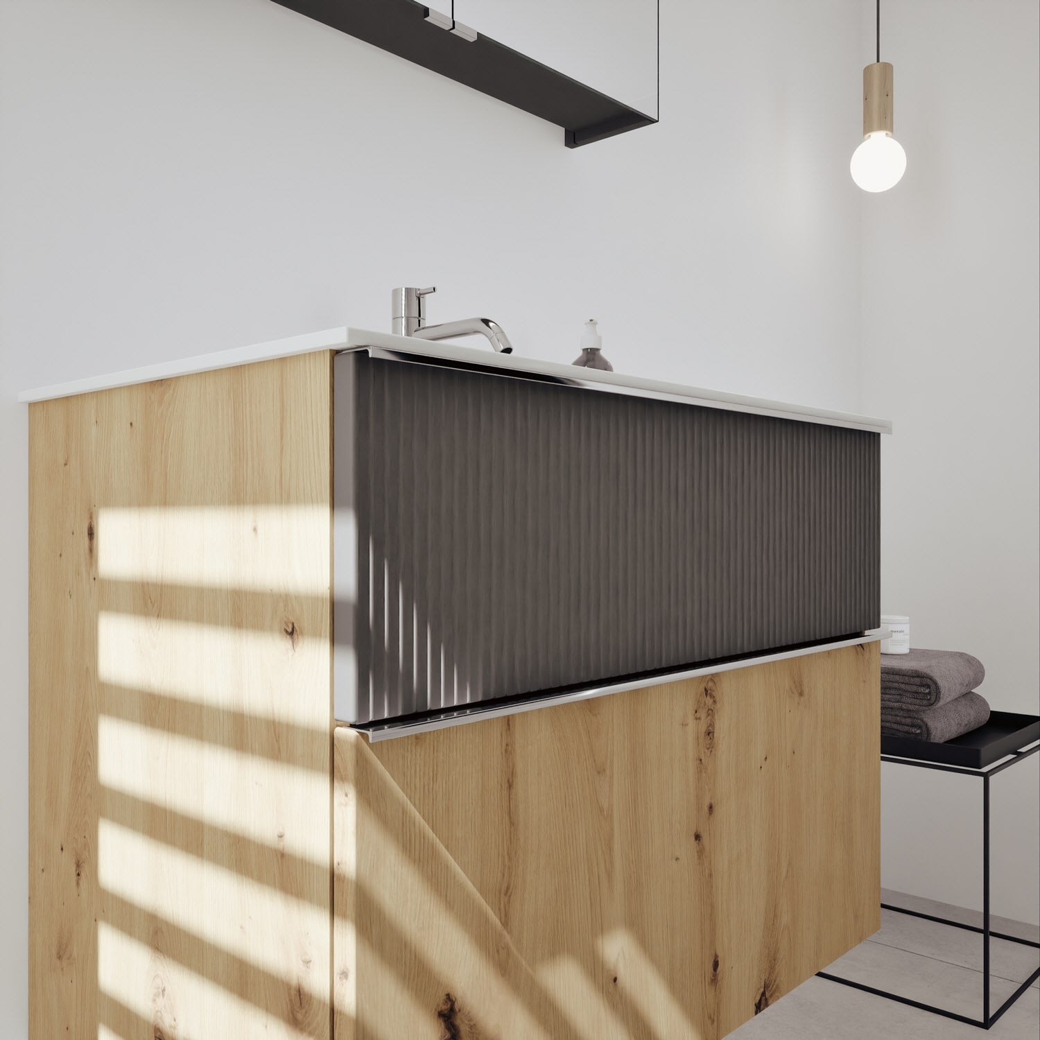 - 1 Schublade oben 35 cm tief, mit vertikaler Struktur inkl. Siphonausschnitt und Inneneinteilung