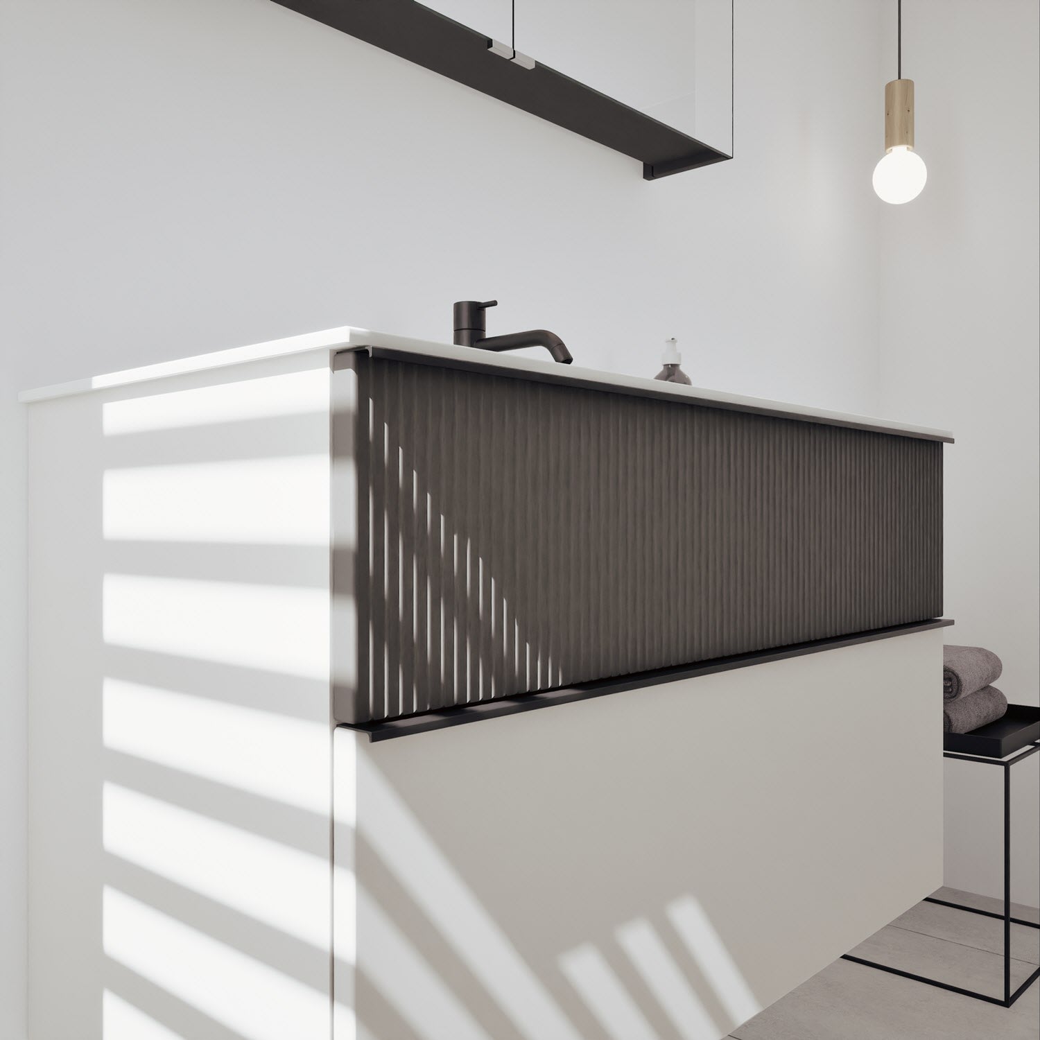 - 1 Schublade oben 35 cm tief, mit vertikaler Struktur inkl. Siphonausschnitt und Inneneinteilung