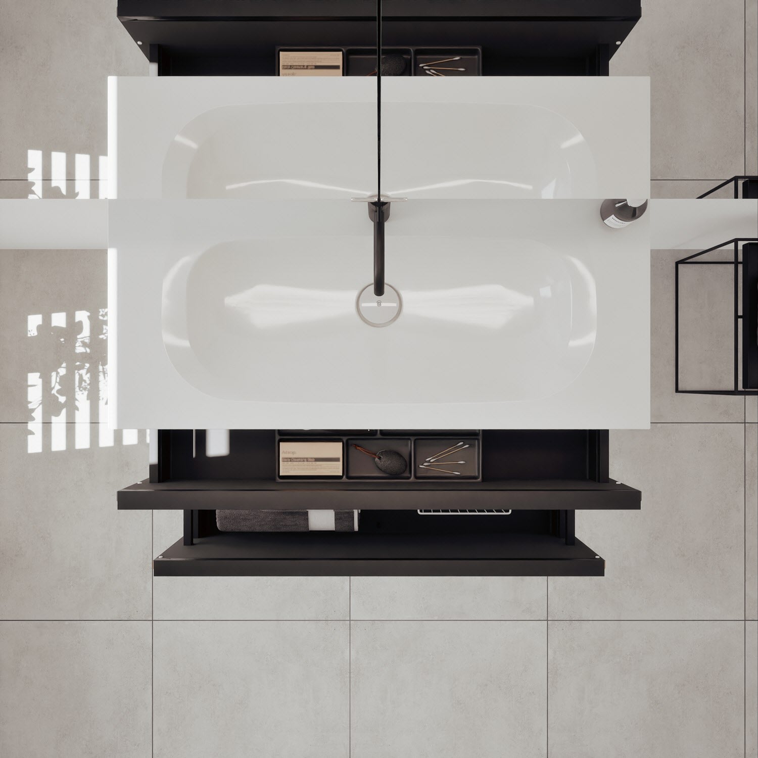 - 1 Schublade oben 35 cm tief, mit vertikaler Struktur inkl. Siphonausschnitt und Inneneinteilung