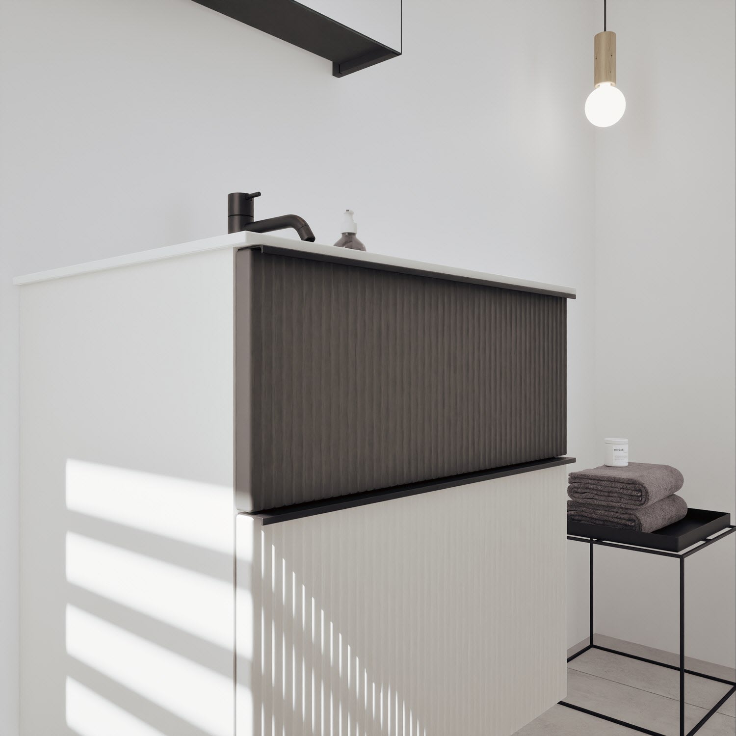 - 1 Schublade oben, 35 cm tief, mit vertikaler Struktur inkl. Siphonausschnitt und Inneneinteilung