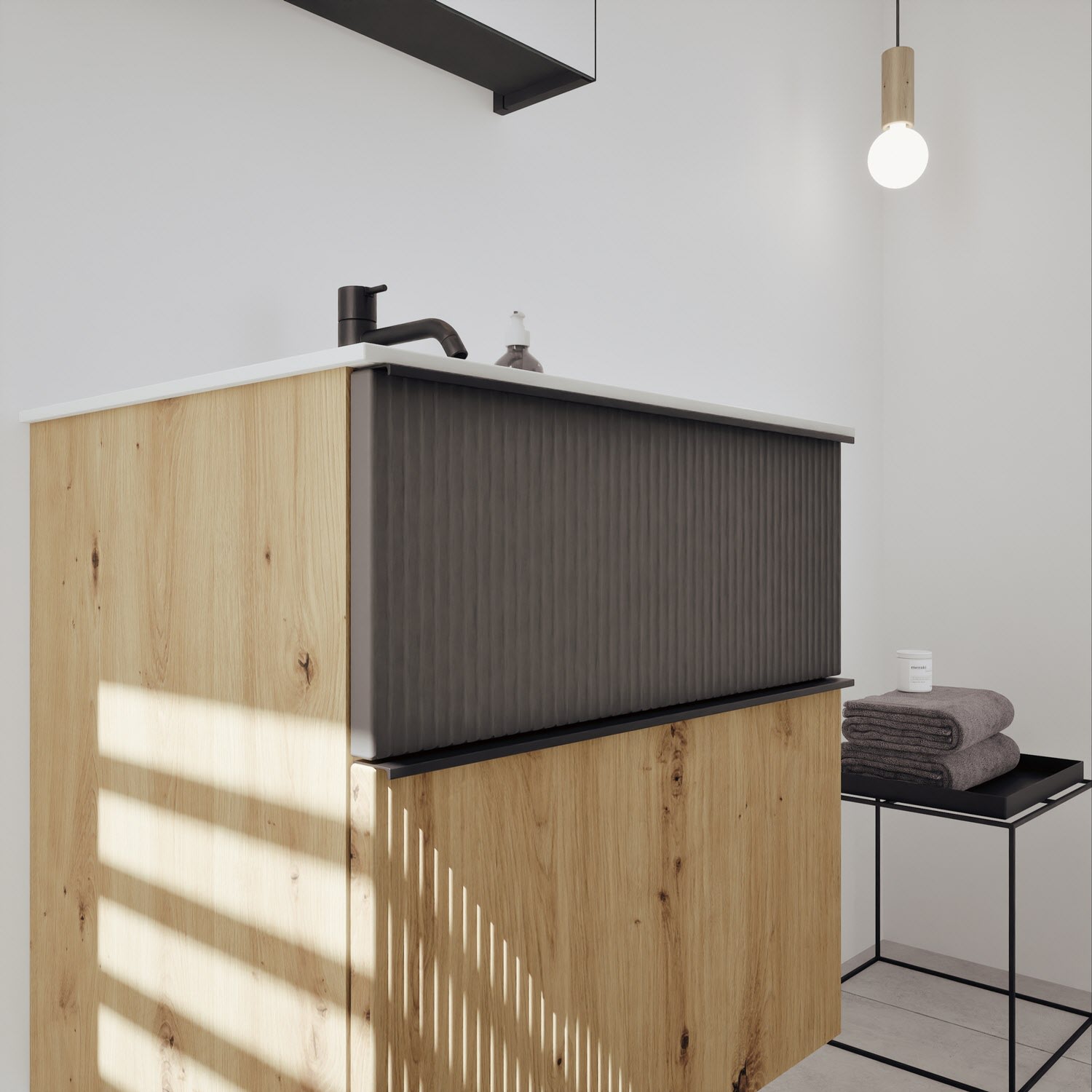 - 1 Schublade oben, 35 cm tief, mit vertikaler Struktur inkl. Siphonausschnitt und Inneneinteilung