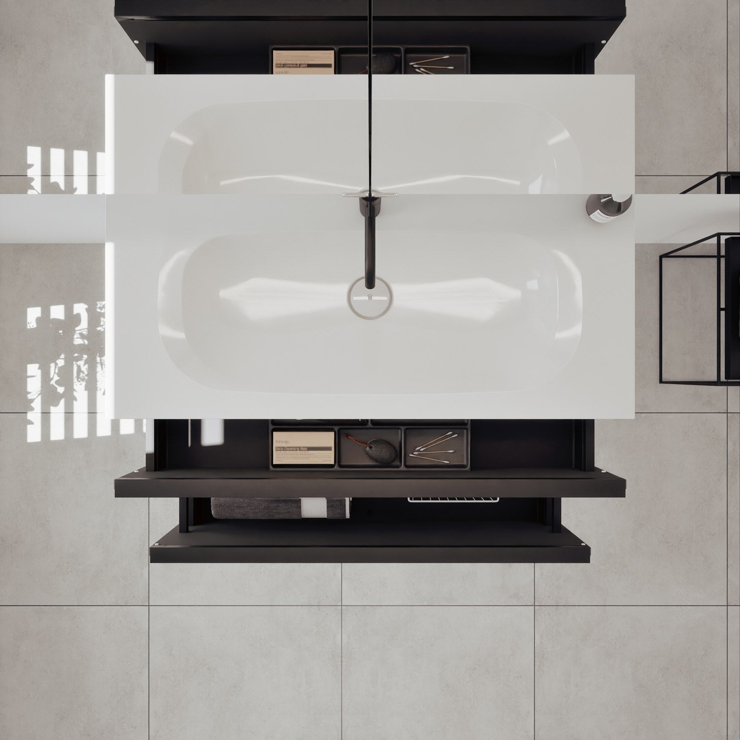 - 1 Schublade oben, 35 cm tief, mit vertikaler Struktur inkl. Siphonausschnitt und Inneneinteilung