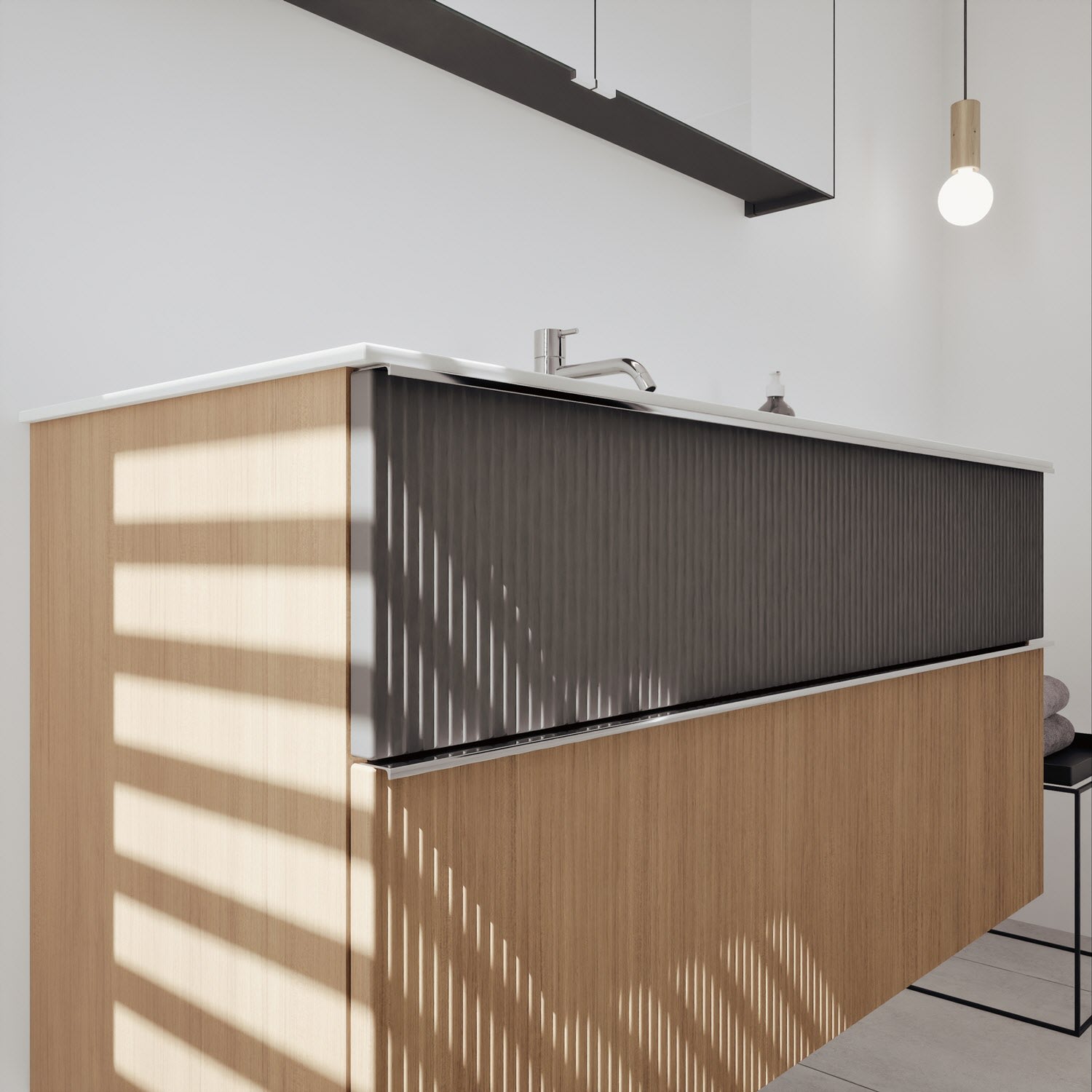 - 1 Schublade oben, 35 cm tief, mit vertikaler Struktur inkl. Siphonausschnitt und Inneneinteilung