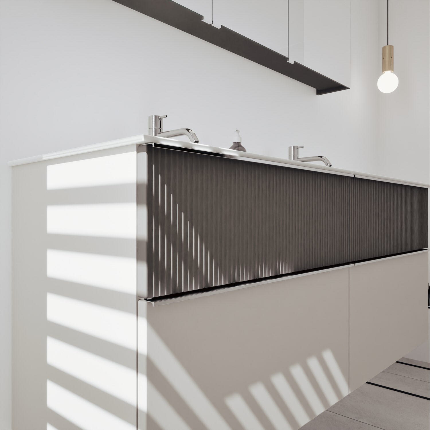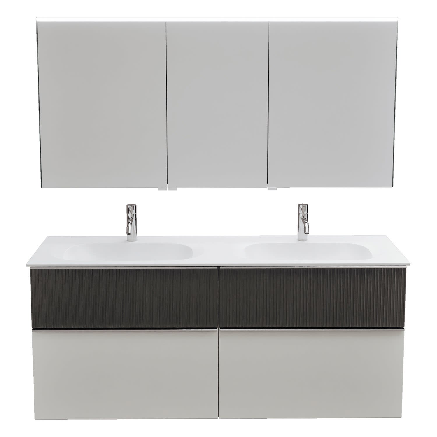 - 2 Schubladen oben, 35 cm tief, mit vertikaler Struktur inkl. mit Siphonausschnitt und Inneneinteilung