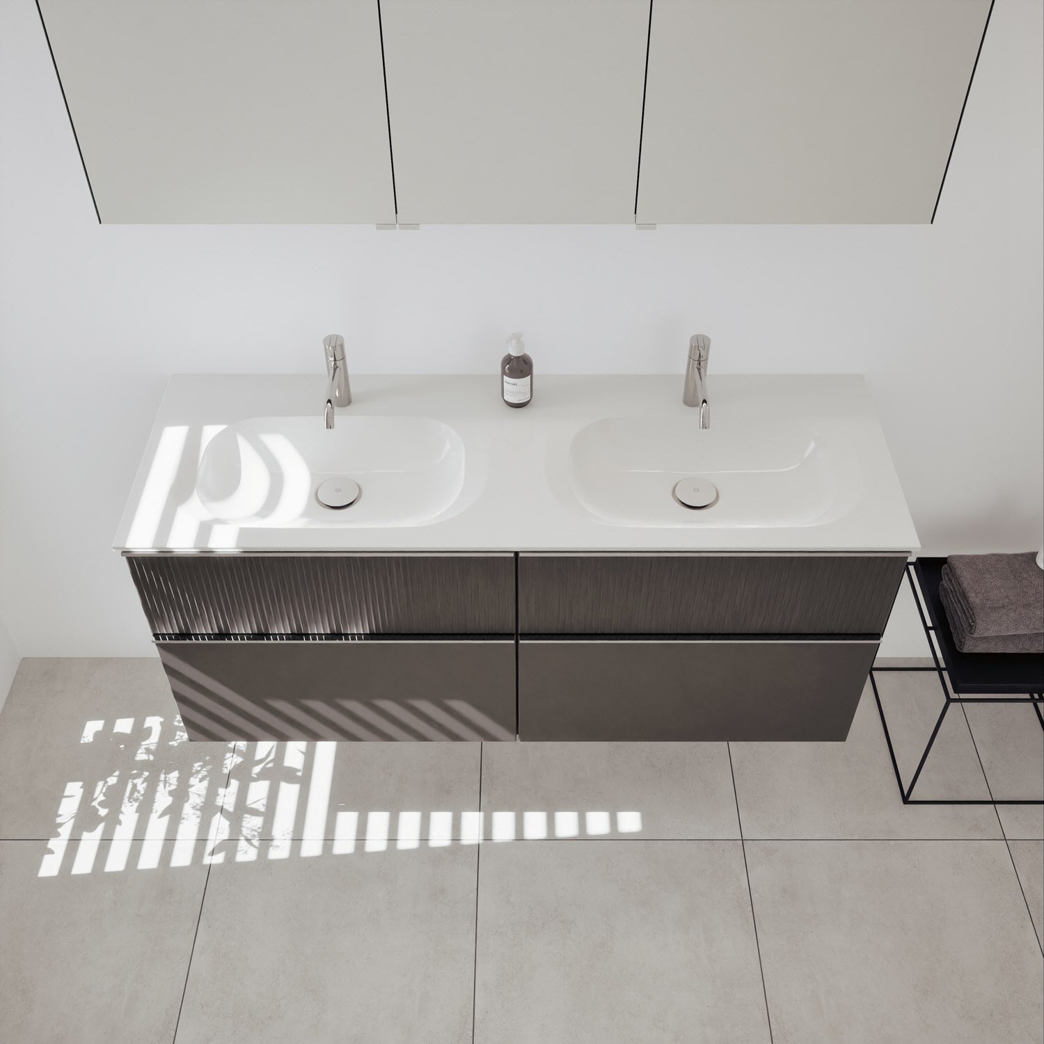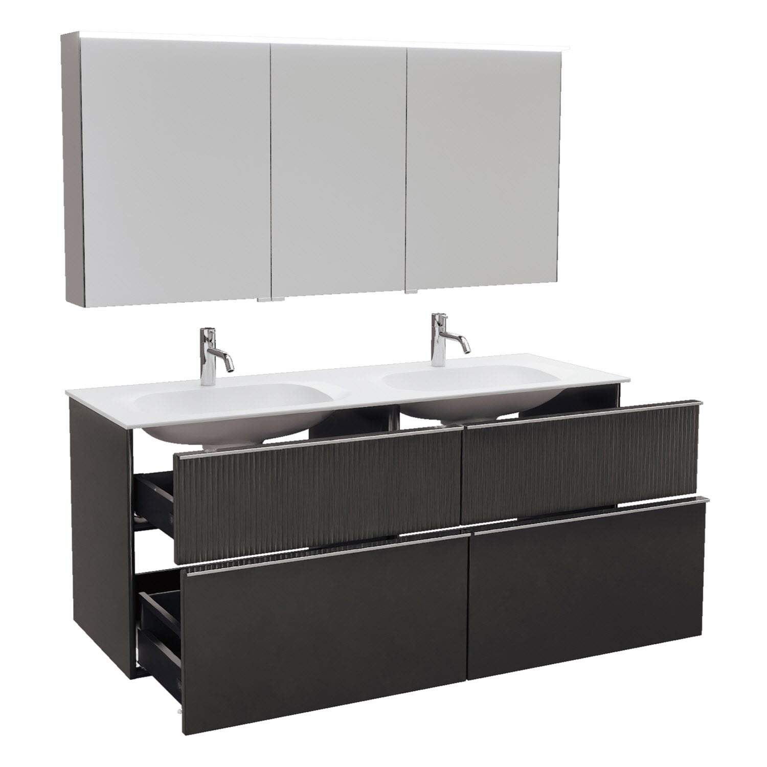 - 2 Schubladen oben, 35 cm tief, mit vertikaler Struktur inkl. mit Siphonausschnitt und Inneneinteilung