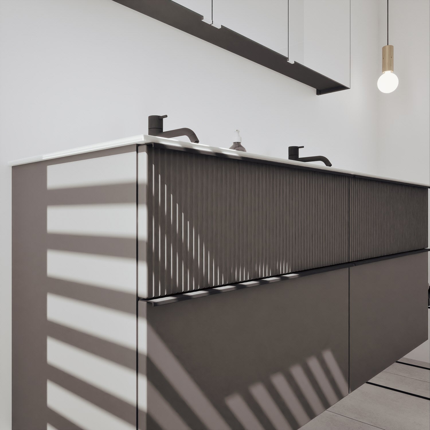 - 2 Schubladen oben, 35 cm tief, mit vertikaler Struktur inkl. mit Siphonausschnitt und Inneneinteilung