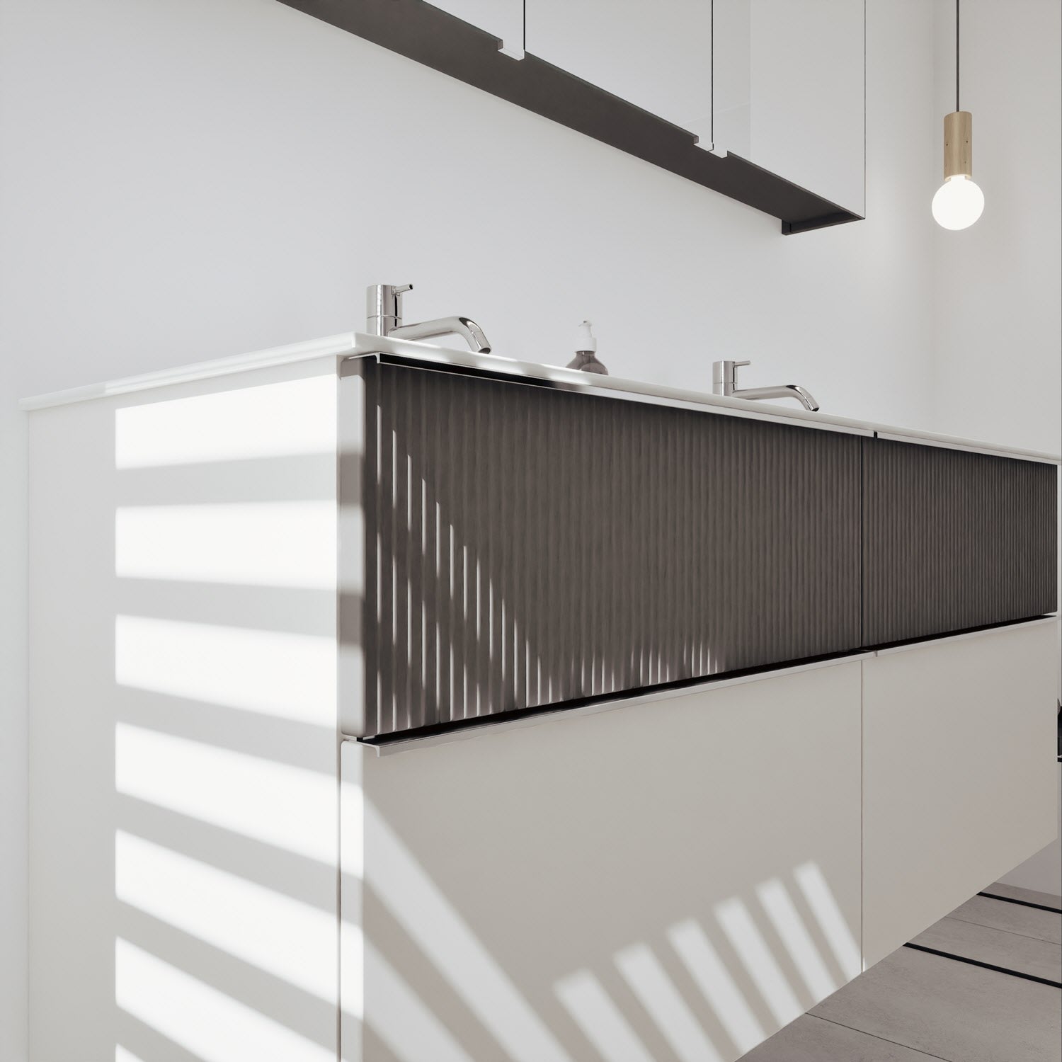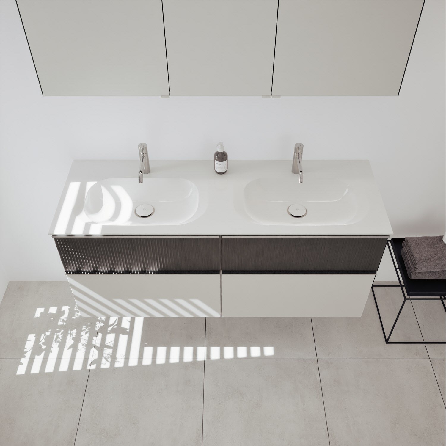 - 2 Schubladen oben, 35 cm tief, mit vertikaler Struktur inkl. mit Siphonausschnitt und Inneneinteilung