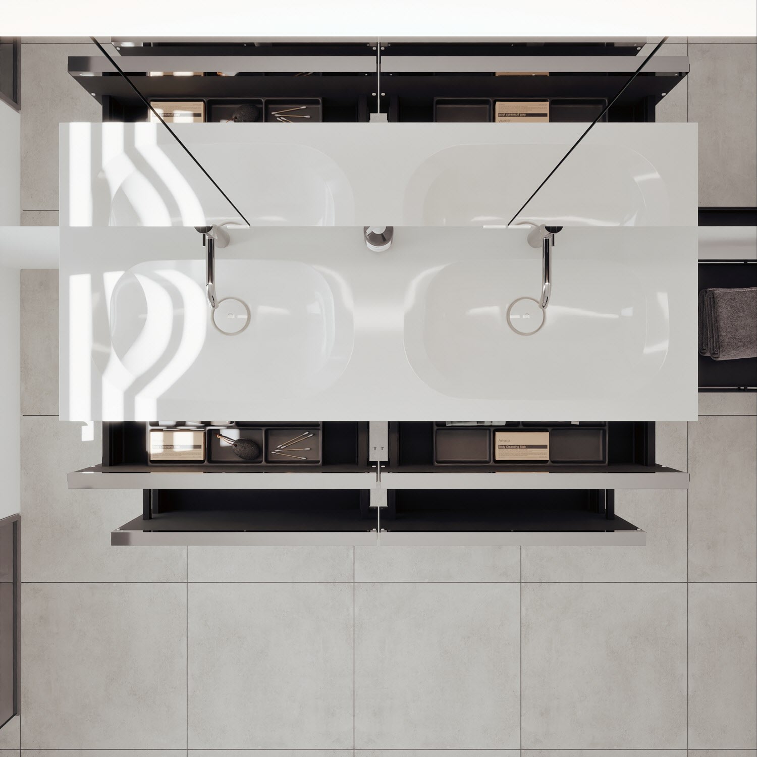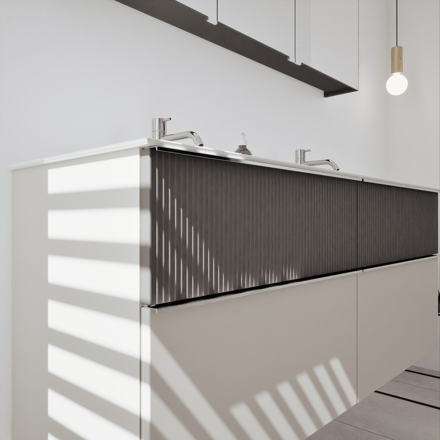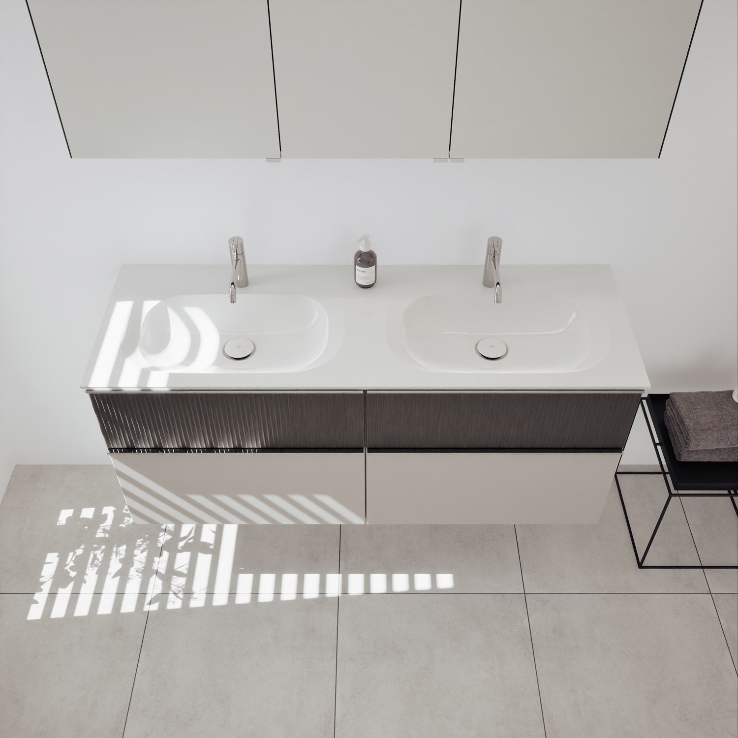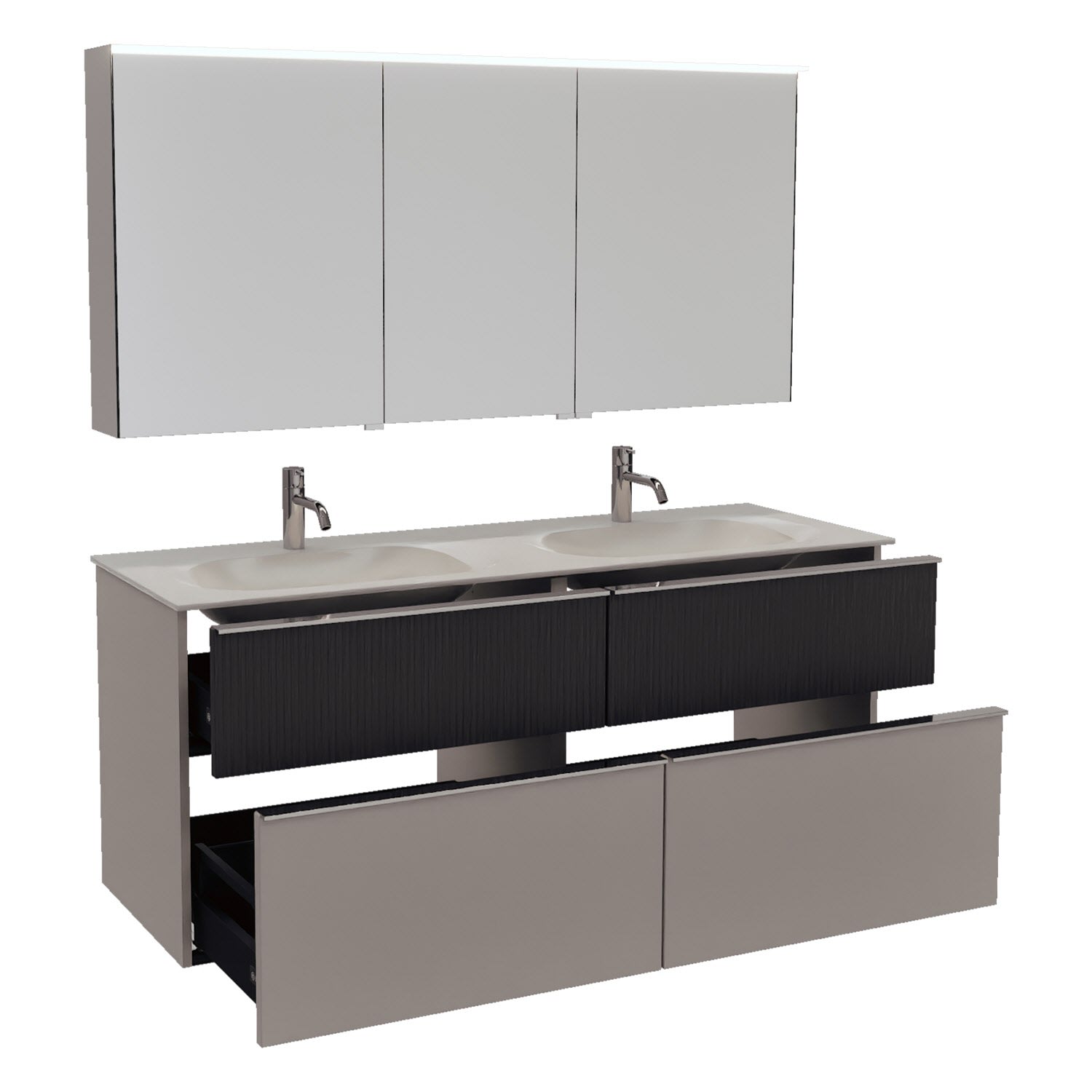- 2 Schubladen oben, 35 cm tief, mit vertikaler Struktur inkl. mit Siphonausschnitt und Inneneinteilung