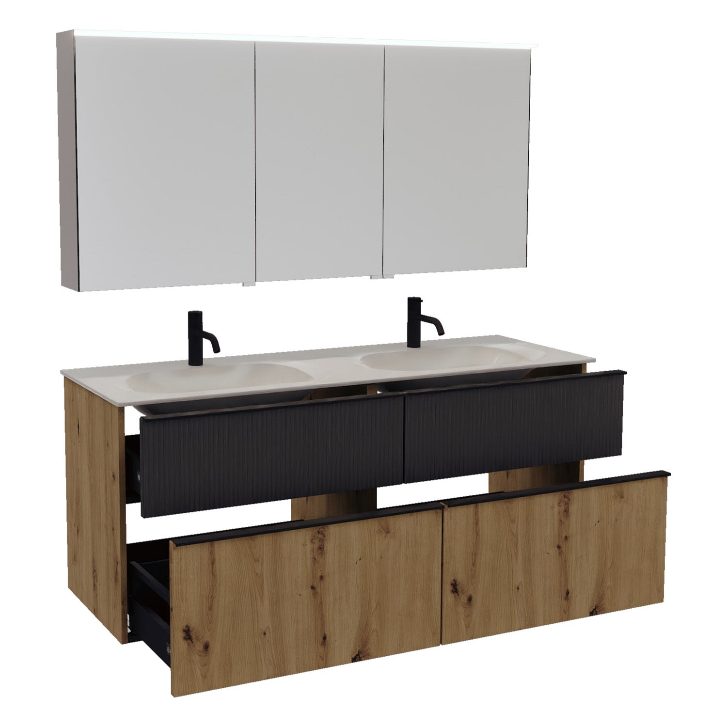 - 2 Schubladen oben, 35 cm tief, mit vertikaler Struktur inkl. mit Siphonausschnitt und Inneneinteilung