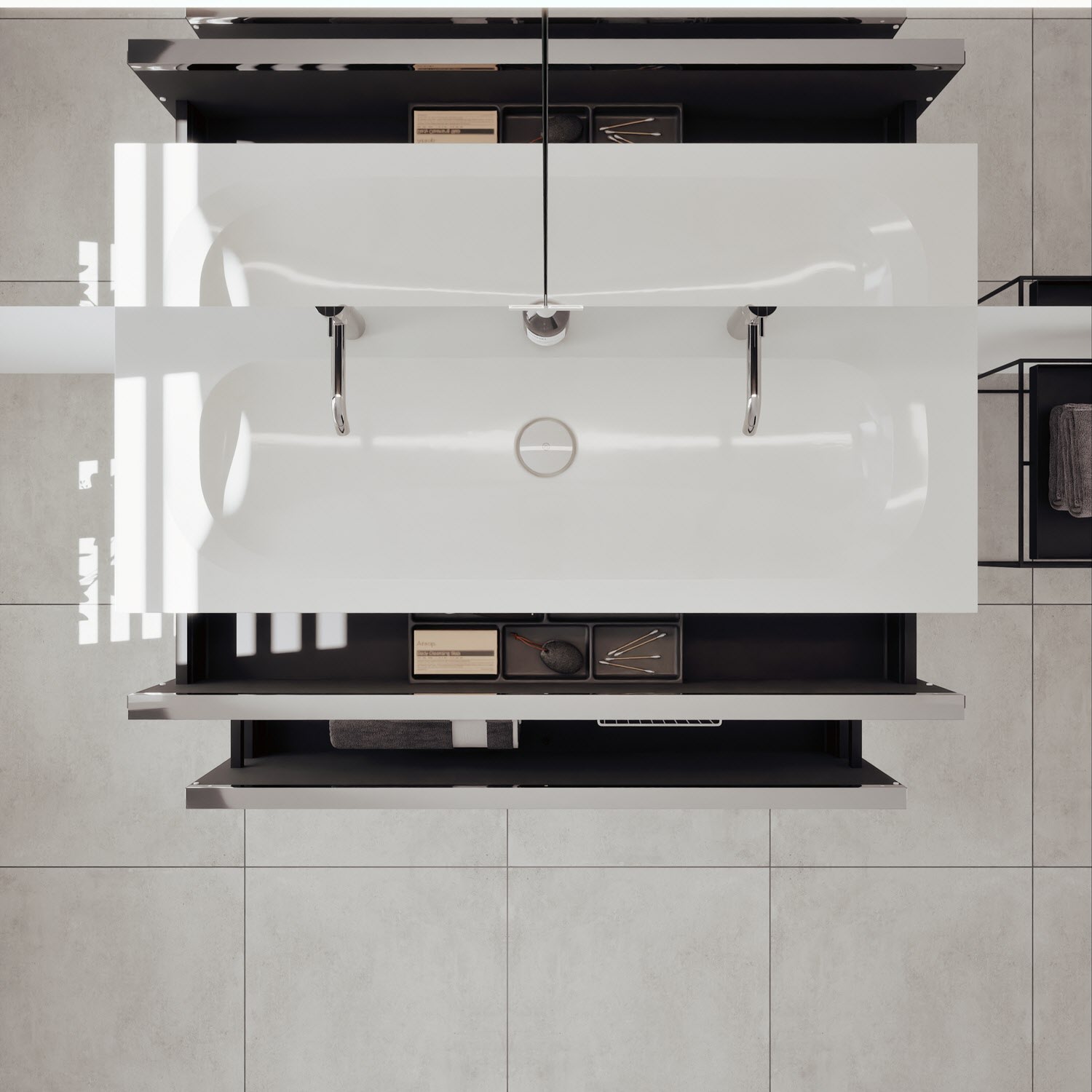- 1 Schublade oben, 35 cm tief, mit vertikaler Struktur inkl. Siphonausschnitt und Inneneinteilung