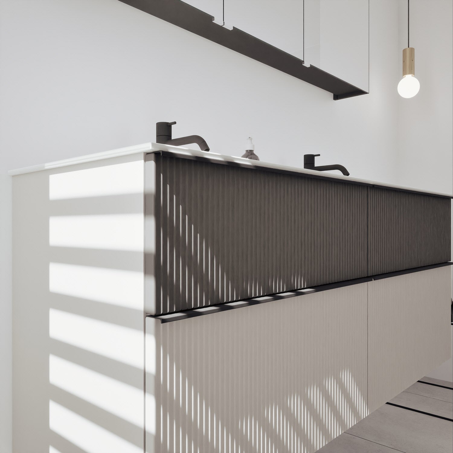 - 2 Schubladen oben, 35 cm tief, mit vertikaler Struktur inkl. mit Siphonausschnitt und Inneneinteilung