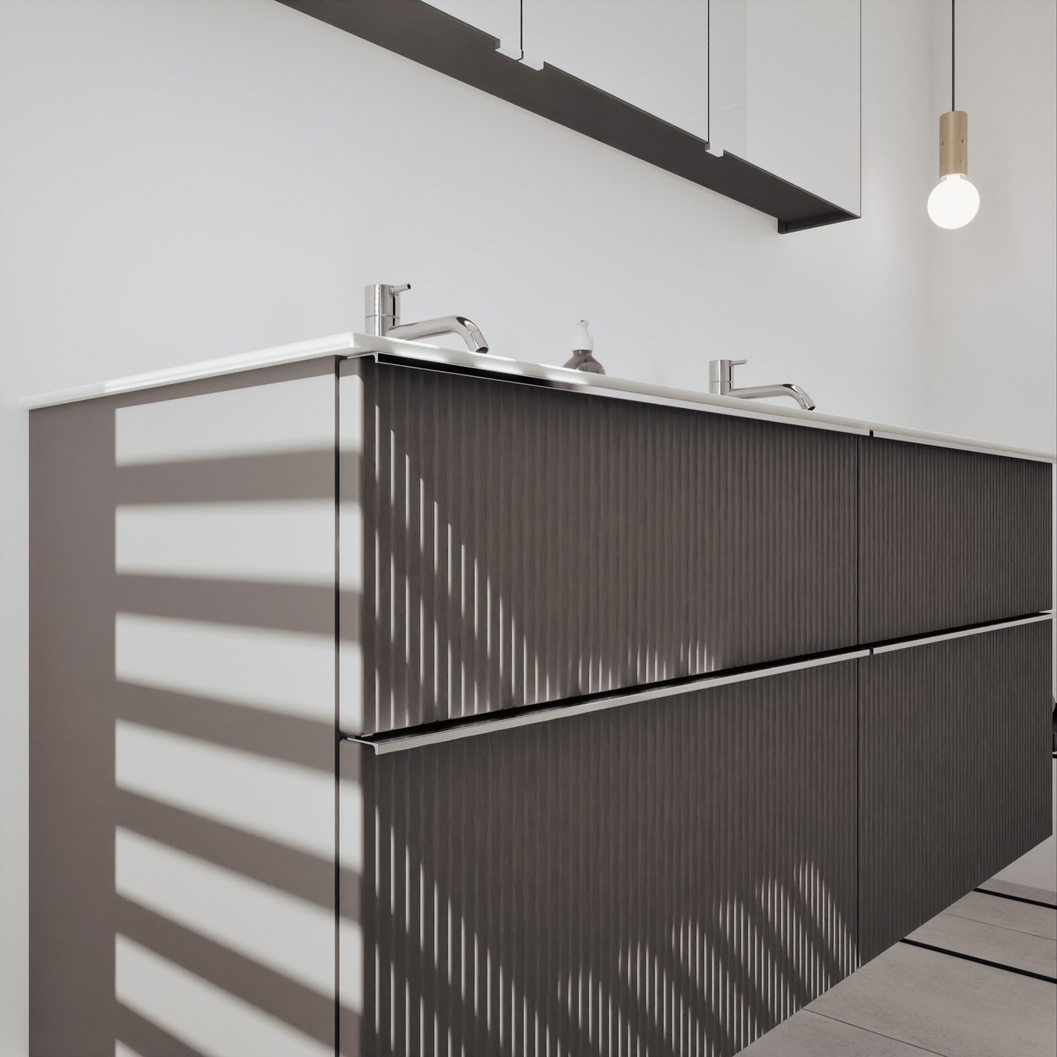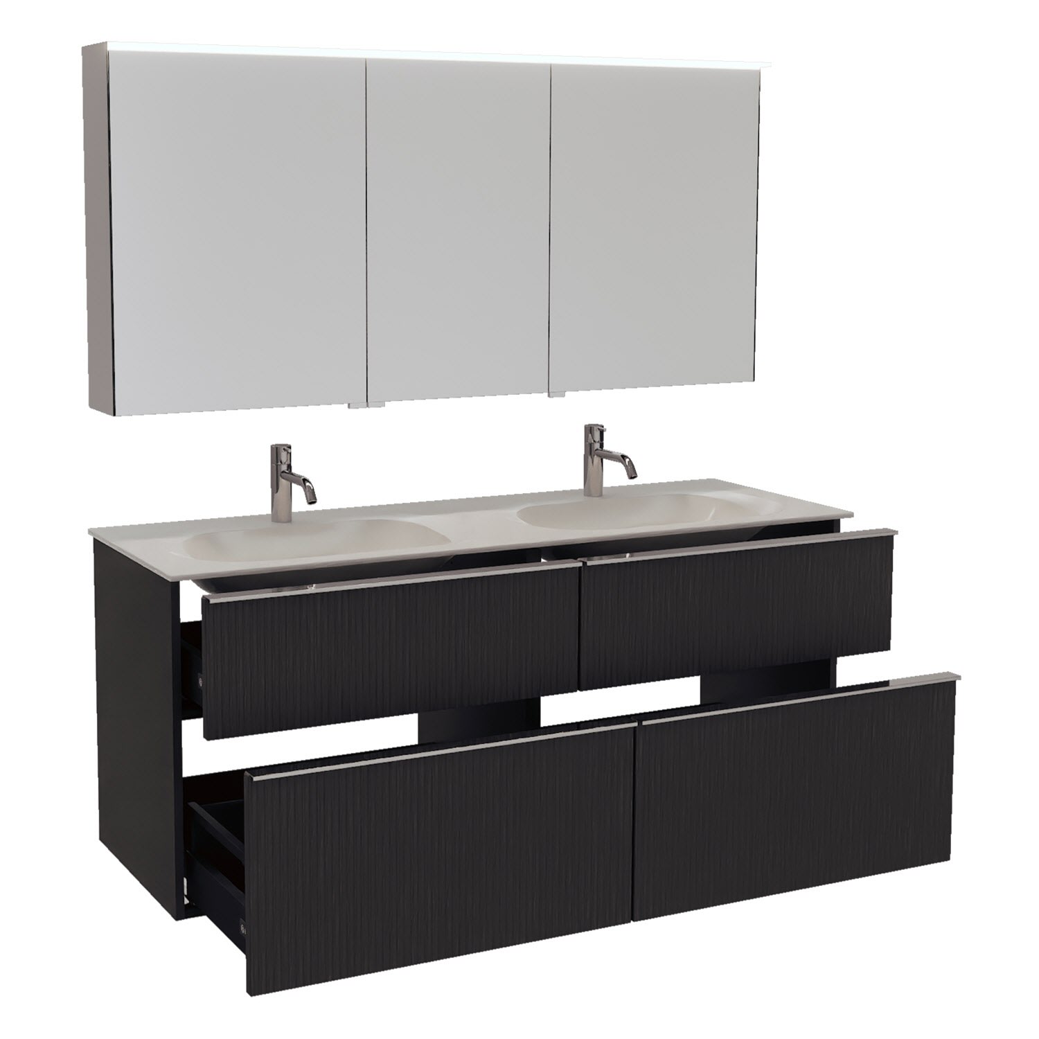 - 2 Schubladen oben, 35 cm tief, mit vertikaler Struktur inkl. mit Siphonausschnitt und Inneneinteilung